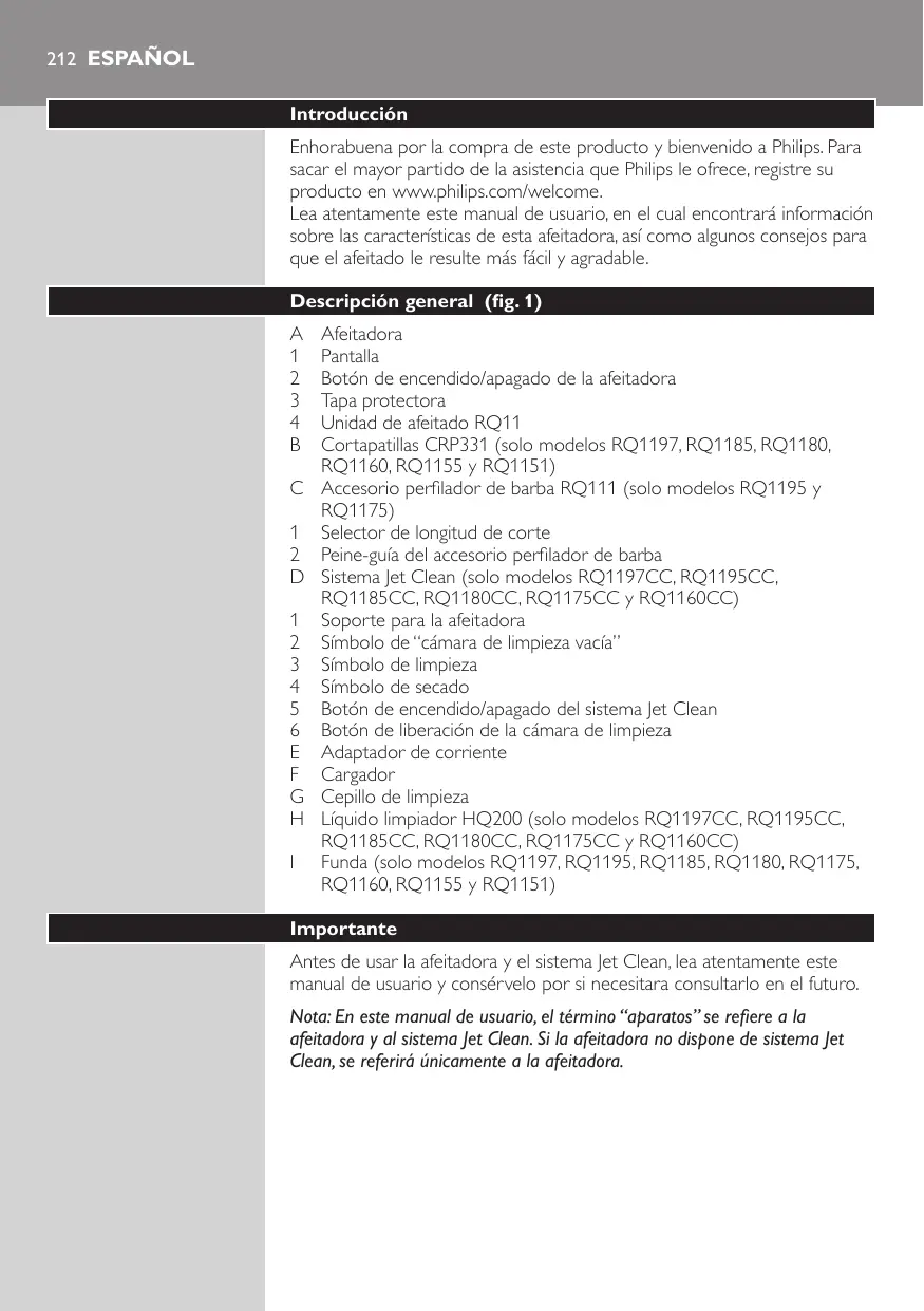Antes de usar la afeitadora y el sistema Jet Clean, lea atentamente este manual de usuario y consérvelo por si necesitara consultarlo en el futuro. Nota: En este manual de usuario, el término “aparatos” se refiere a la afeitadora y al sistema Jet Clean. Si la afeitadora no dispone de sistema Jet Clean, se referirá únicamente a la afeitadora.