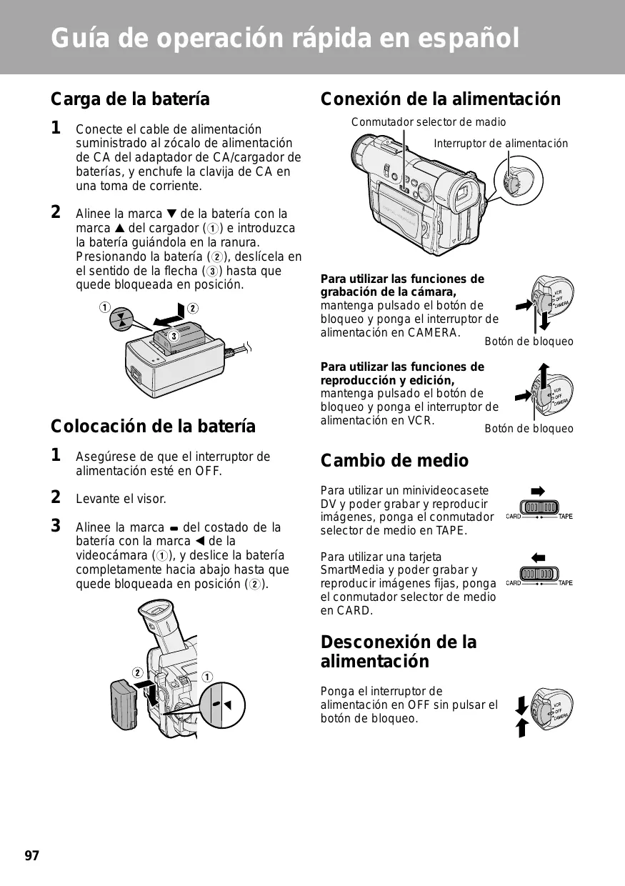 Alinee la marca - del costado de la batería con la marca q de la videocámara (1), y deslice la batería completamente hacia abajo hasta que quede bloqueada en posición (2). Para utilizar las funciones de reproducción y edición, mantenga pulsado el botón de bloqueo y ponga el interruptor de alimentación en VCR. Botón de bloqueo Cambio de medio Para utilizar un minivideocasete DV y poder grabar y reproducir imágenes, ponga el conmutador selector de medio en TAPE. Para utilizar una tarjeta SmartMedia y poder grabar y reproducir imágenes fijas, ponga el conmutador selector de medio en CARD. Desconexión de la alimentación Ponga el interruptor de alimentación en OFF sin pulsar el botón de bloqueo.