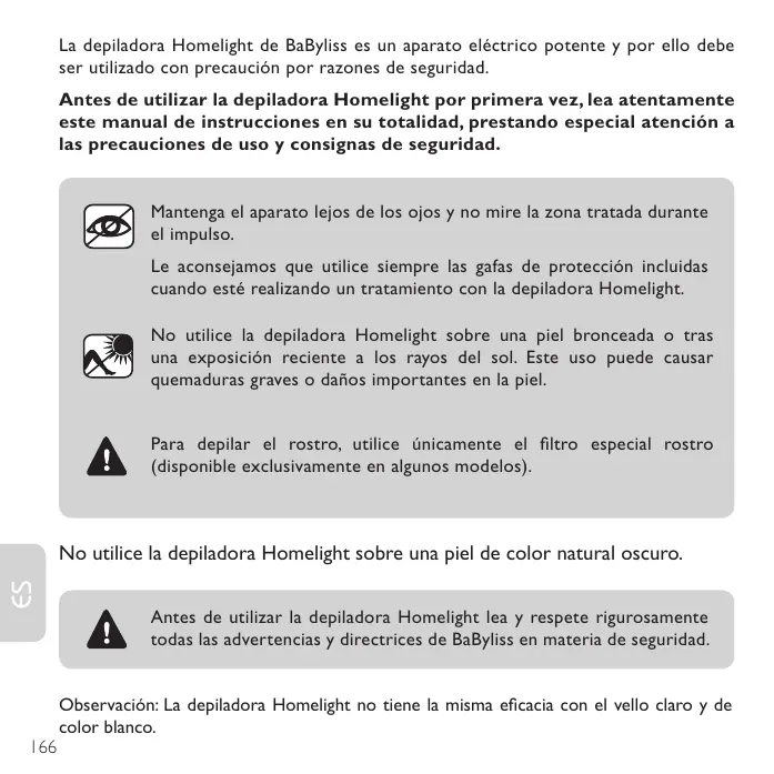 La depiladora Homelight de BaByliss es un aparato eléctrico potente y por ello debe ser utilizado con precaución por razones de seguridad. Antes de utilizar la depiladora Homelight por primera vez, lea atentamente este manual de instrucciones en su totalidad, prestando especial atención a las precauciones de uso y consignas de seguridad. Mantenga el aparato lejos de los ojos y no mire la zona tratada durante el impulso. Le aconsejamos que utilice siempre las gafas de protección incluidas cuando esté realizando un tratamiento con la depiladora Homelight. No utilice la depiladora Homelight sobre una piel bronceada o tras una exposición reciente a los rayos del sol. Este uso puede causar quemaduras graves o daños importantes en la piel. Para depilar el rostro, utilice únicamente el filtro especial rostro (disponible exclusivamente en algunos modelos).