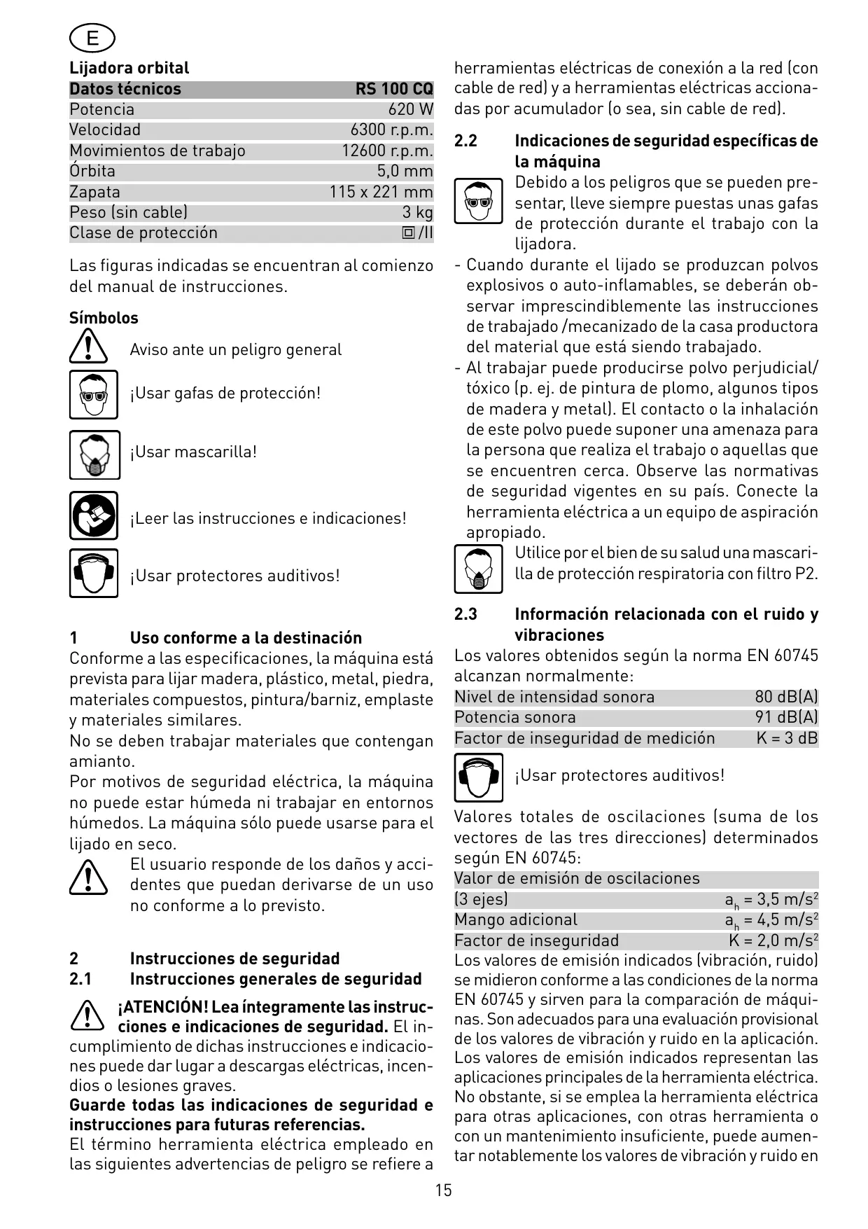 Uso conforme a la destinación Conforme a las especificaciones, la máquina está prevista para lijar madera, plástico, metal, piedra, materiales compuestos, pintura/barniz, emplaste y materiales similares. No se deben trabajar materiales que contengan amianto. Por motivos de seguridad eléctrica, la máquina no puede estar húmeda ni trabajar en entornos húmedos. La máquina sólo puede usarse para el lijado en seco. El usuario responde de los daños y accidentes que puedan derivarse de un uso no conforme a lo previsto. 2 2.1
