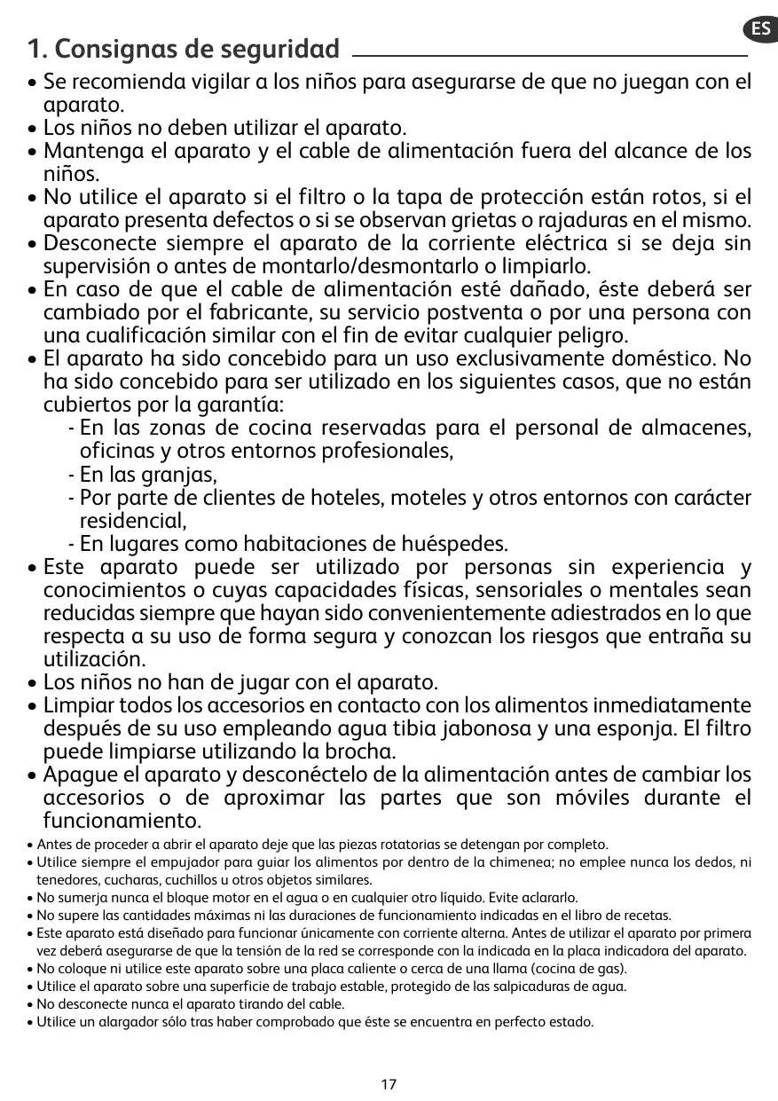 • Los niños no deben utilizar el aparato. • Mantenga el aparato y el cable de alimentación fuera del alcance de los niños. • No utilice el aparato si el filtro o la tapa de protección están rotos, si el aparato presenta defectos o si se observan grietas o rajaduras en el mismo. • Desconecte siempre el aparato de la corriente eléctrica si se deja sin supervisión o antes de montarlo/desmontarlo o limpiarlo. • En caso de que el cable de alimentación esté dañado, éste deberá ser cambiado por el fabricante, su servicio postventa o por una persona con una cualificación similar con el fin de evitar cualquier peligro. • El aparato ha sido concebido para un uso exclusivamente doméstico. No ha sido concebido para ser utilizado en los siguientes casos, que no están cubiertos por la garantía: - En las zonas de cocina reservadas para el personal de almacenes, oficinas y otros entornos profesionales, - En las granjas, - Por parte de clientes de hoteles, moteles y otros entornos con carácter residencial, - En lugares como habitaciones de huéspedes. • Este aparato puede ser utilizado por personas sin experiencia y conocimientos o cuyas capacidades físicas, sensoriales o mentales sean reducidas siempre que hayan sido convenientemente adiestrados en lo que respecta a su uso de forma segura y conozcan los riesgos que entraña su utilización. • Los niños no han de jugar con el aparato. • Limpiar todos los accesorios en contacto con los alimentos inmediatamente después de su uso empleando agua tibia jabonosa y una esponja. El filtro puede limpiarse utilizando la brocha. • Apague el aparato y desconéctelo de la alimentación antes de cambiar los accesorios o de aproximar las partes que son móviles durante el funcionamiento. • Antes de proceder a abrir el aparato deje que las piezas rotatorias se detengan por completo. • Utilice siempre el empujador para guiar los alimentos por dentro de la chimenea; no emplee nunca los dedos, ni tenedores, cucharas, cuchillos u otros objetos similares. • No sumerja nunca el bloque motor en el agua o en cualquier otro líquido. Evite aclararlo. • No supere las cantidades máximas ni las duraciones de funcionamiento indicadas en el libro de recetas. • Este aparato está diseñado para funcionar únicamente con corriente alterna. Antes de utilizar el aparato por primera vez deberá asegurarse de que la tensión de la red se corresponde con la indicada en la placa indicadora del aparato. • No coloque ni utilice este aparato sobre una placa caliente o cerca de una llama (cocina de gas). • Utilice el aparato sobre una superficie de trabajo estable, protegido de las salpicaduras de agua. • No desconecte nunca el aparato tirando del cable. • Utilice un alargador sólo tras haber comprobado que éste se encuentra en perfecto estado.