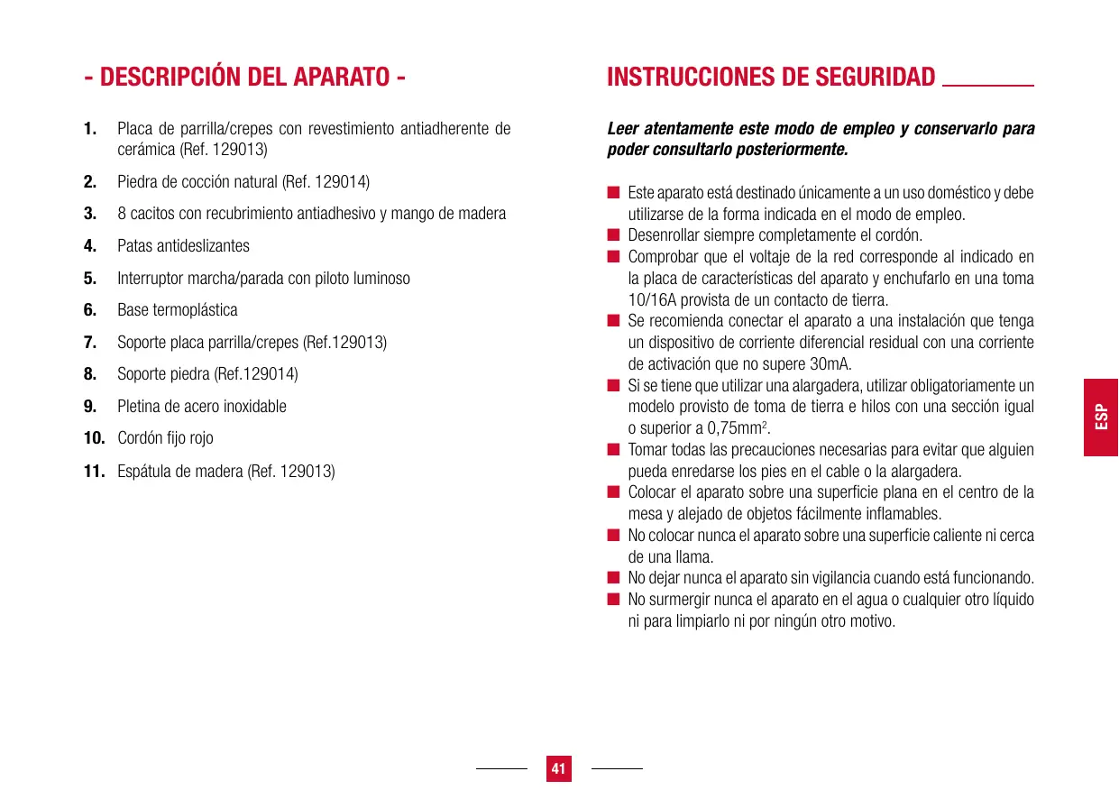MEDIO AMBIENTE ■■ Placa parrilla/crepes con revestimiento antiadhesivo (Ref. 129003) o Piedra de cocción natural (Ref. 129004) ■■ 8 cacitos con recubrimiento antiadhesivo y mango de madera ■■ Base termoplástica ■■ Cordón enrollable debajo del aparato ■■ 230V-50Hz-800W Protección del medio ambiente- DIRECTIVA 2002/96/CE Para preservar nuestro medio ambiente y nuestra salud, la liminación al final de su vida útil de los aparatos eléctricos debe realizarse según reglas bien precisas y requiere la implicación de cada uno de nosotros, tanto si se es proveedor como usuario. Por esta razón, su aparato, tal y como lo indica el símbolo que aparece en su placa descriptiva, no debe arrojarse en ningún caso a un cubo de basura pública o privada destinado à las basuras domésticas. Durante su eliminación, es responsabilidad suya depositar el aparato en un centro de recogida pública designado para el reciclaje de equipos eléctricos o electrónicos. Para obtener más información sobre los centros de recogida y reciclaje de los aparatos desechados, póngase en contacto con las autoridades locales de su región, con los servicios de recogida de basuras domésticas o con la tienda en la que compró su aparato.