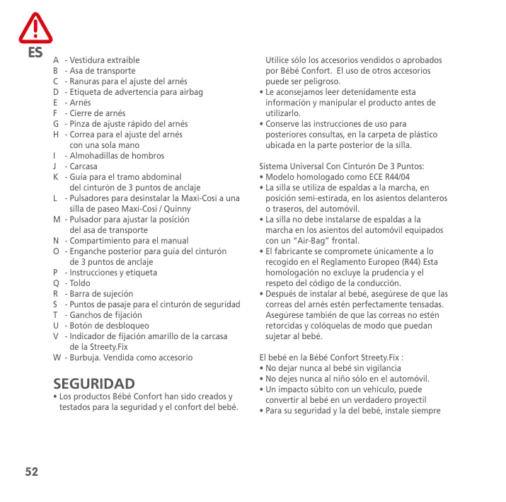 - Vestidura extraíble - Asa de transporte - Ranuras para el ajuste del arnés - Etiqueta de advertencia para airbag - Arnés - Cierre de arnés - Pinza de ajuste rápido del arnés - Correa para el ajuste del arnés con una sola mano - Almohadillas de hombros - Carcasa - Guía para el tramo abdominal del cinturón de 3 puntos de anclaje - Pulsadores para desinstalar la Maxi-Cosi a una silla de paseo Maxi-Cosi / Quinny - Pulsador para ajustar la posición del asa de transporte - Compartimiento para el manual - Enganche posterior para guía del cinturón de 3 puntos de anclaje - Instrucciones y etiqueta - Toldo - Barra de sujeción - Puntos de pasaje para el cinturón de seguridad - Ganchos de fijación - Botón de desbloqueo - Indicador de fijación amarillo de la carcasa de la Streety.Fix - Burbuja. Vendida como accesorio SEGURIDAD