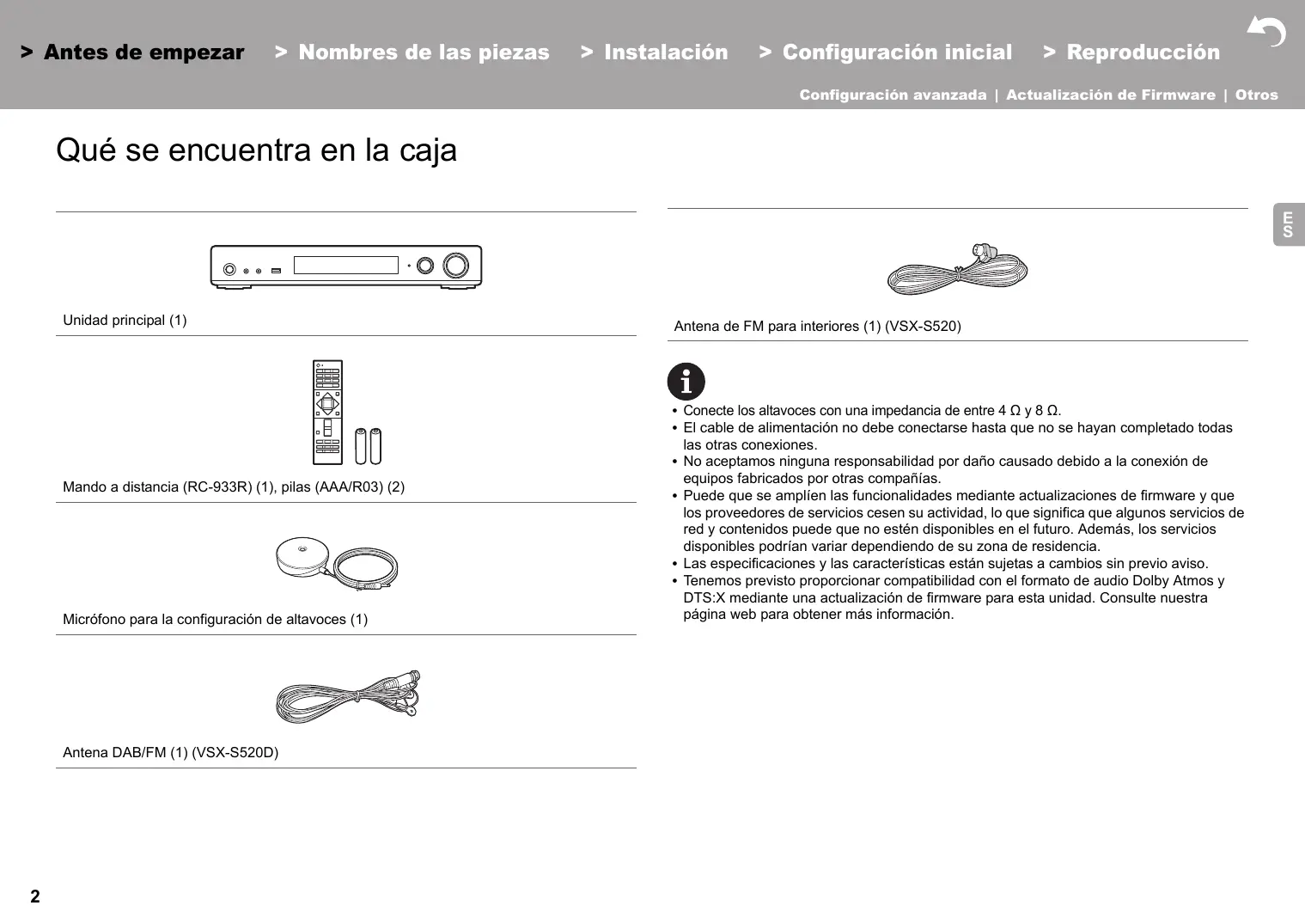 Qué se encuentra en la caja 2 Nombres de las piezas Panel frontal 3 Panel trasero 4 Mando a distancia 6 Pantalla 7 Instalación 1. Conexión de los altavoces 8 2. Conexión del TV 11 3. Conexión de los componentes AV HDMI 12 4. Conexión de los componentes de audio 13 5. Conexión de otros cables 14 Configuración inicial Configuración inicial con el asistente de arranque automático 15 Reproducción Reproducción de componente AV 18 Radio por Internet 19 Spotify 21 Music Server 22 Dispositivo de almacenamiento USB 24 AirPlay® 26 BLUETOOTH® Reproducción 27 Escuchar la radio FM/DAB 28 Modos de audición 31 AV Adjust 40 Configuración avanzada System Setup 42 MCACC 51 Network/Bluetooth 54 Actualización de Firmware Actualización de Firmware 57 Otros Resolución de problemas 60 Especificaciones generales 65 Acerca de HDMI 67 Información sobre licencias y marcas comerciales 68