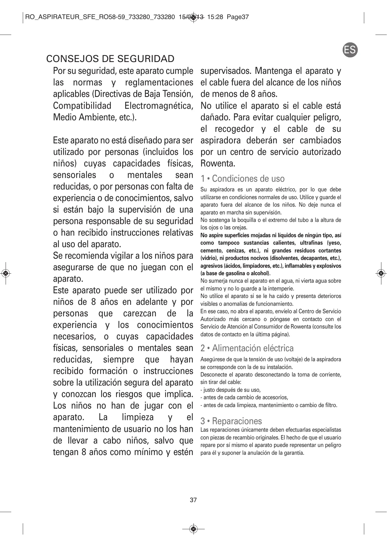 Por su seguridad, este aparato cumple las normas y reglamentaciones aplicables (Directivas de Baja Tensión, Compatibilidad Electromagnética, Medio Ambiente, etc.). supervisados. Mantenga el aparato y el cable fuera del alcance de los niños de menos de 8 años. No utilice el aparato si el cable está dañado. Para evitar cualquier peligro, el recogedor y el cable de su Este aparato no está diseñado para ser aspiradora deberán ser cambiados utilizado por personas (incluidos los por un centro de servicio autorizado niños) cuyas capacidades físicas, Rowenta. sensoriales o mentales sean 1 • Condiciones de uso reducidas, o por personas con falta de Su aspiradora es un aparato eléctrico, por lo que debe experiencia o de conocimientos, salvo utilizarse en condiciones normales de uso. Utilice y guarde el aparato fuera del alcance de los niños. No deje nunca el si están bajo la supervisión de una aparato en marcha sin supervisión. persona responsable de su seguridad No sostenga la boquilla o el extremo del tubo a la altura de los ojos o las orejas. o han recibido instrucciones relativas No aspire superficies mojadas ni líquidos de ningún tipo, así como tampoco sustancias calientes, ultrafinas (yeso, al uso del aparato. cemento, cenizas, etc.), ni grandes residuos cortantes Se recomienda vigilar a los niños para (vidrio), ni productos nocivos (disolventes, decapantes, etc.), asegurarse de que no juegan con el agresivos (ácidos, limpiadores, etc.), inflamables y explosivos (a base de gasolina o alcohol). aparato. No sumerja nunca el aparato en el agua, ni vierta agua sobre el mismo y no lo guarde a la intemperie. Este aparato puede ser utilizado por No utilice el aparato si se le ha caído y presenta deterioros niños de 8 años en adelante y por visibles o anomalías de funcionamiento. ese caso, no abra el aparato, envíelo al Centro de Servicio personas que carezcan de la En Autorizado más cercano o póngase en contacto con el experiencia y los conocimientos Servicio de Atención al Consumidor de Rowenta (consulte los necesarios, o cuyas capacidades datos de contacto en la última página). físicas, sensoriales o mentales sean 2 • Alimentación eléctrica reducidas, siempre que hayan Asegúrese de que la tensión de uso (voltaje) de la aspiradora se corresponde con la de su instalación. recibido formación o instrucciones Desconecte el aparato desconectando la toma de corriente, sobre la utilización segura del aparato sin tirar del cable: - justo después de su uso, y conozcan los riesgos que implica. - antes de cada cambio de accesorios, Los niños no han de jugar con el - antes de cada limpieza, mantenimiento o cambio de filtro. aparato. La limpieza y el 3 • Reparaciones mantenimiento de usuario no los han Las reparaciones únicamente deben efectuarlas especialistas con piezas de recambio originales. El hecho de que el usuario de llevar a cabo niños, salvo que repare por sí mismo el aparato puede representar un peligro tengan 8 años como mínimo y estén para él y suponer la anulación de la garantía.