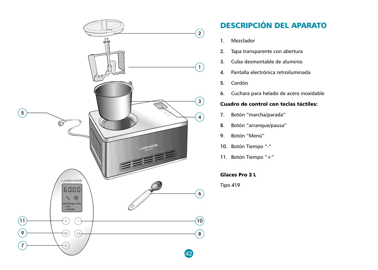 - Cuidado, si el motor está recalentado cuando el helado se solidifica, el aparato se pondrá en seguidad y se detendra. Si ello no ocurre, apagar el aparato, desenchufarlo y dejar que se enfré durante various Minutes. Después arrancará normalmente.