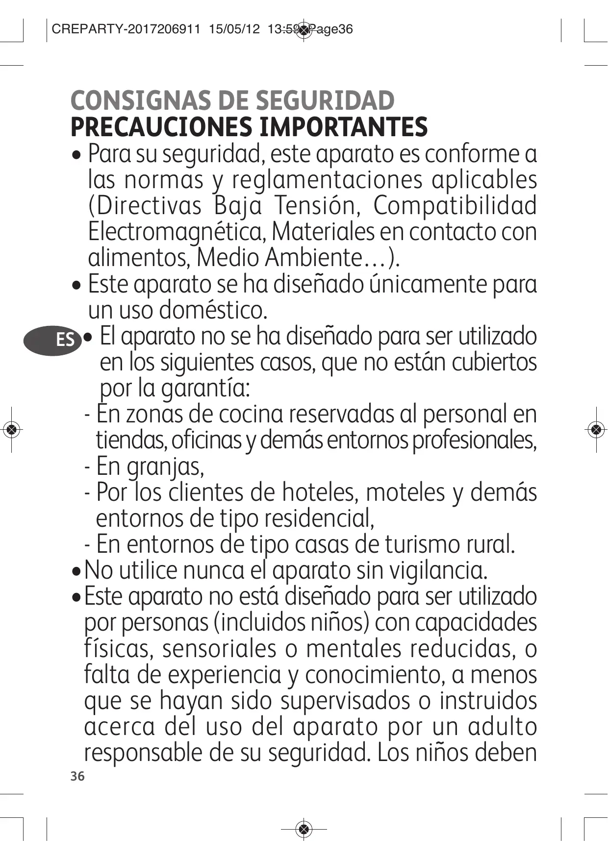 CONSIGNAS DE SEGURIDAD PRECAUCIONES IMPORTANTES • Para su seguridad, este aparato es conforme a las normas y reglamentaciones aplicables (Directivas Baja Tensión, Compatibilidad Electromagnética, Materiales en contacto con alimentos, Medio Ambiente…). • Este aparato se ha diseñado únicamente para un uso doméstico. ES • El aparato no se ha diseñado para ser utilizado en los siguientes casos, que no están cubiertos por la garantía: - En zonas de cocina reservadas al personal en tiendas, oficinas y demás entornos profesionales, - En granjas, - Por los clientes de hoteles, moteles y demás entornos de tipo residencial, - En entornos de tipo casas de turismo rural. •No utilice nunca el aparato sin vigilancia. •Este aparato no está diseñado para ser utilizado por personas (incluidos niños) con capacidades físicas, sensoriales o mentales reducidas, o falta de experiencia y conocimiento, a menos que se hayan sido supervisados o instruidos acerca del uso del aparato por un adulto responsable de su seguridad. Los niños deben 36