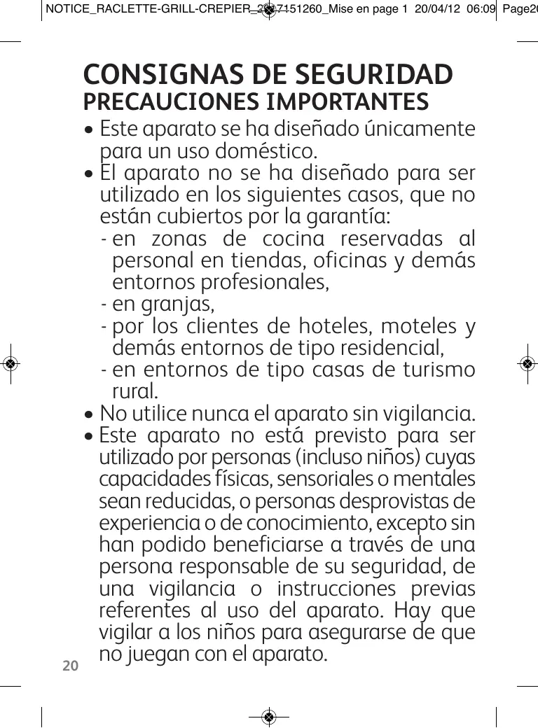 • Leer atentamente y guardar al alcance de la mano las instrucciones de este folleto, comunes a las diferentes versiones según los accesorios suministrados con el aparato. • Si se produce un accidente, deje correr agua fría inmediatamente sobre la quemadura y acuda a un médico si fuera necesario. • Los humos causados por la cocción pueden ser peligrosos para los animales que tengan un sistema respiratorio particularmente sensible, como los pájaros. Aconsejamos a los propietarios de pájaros que los alejen del lugar donde se realiza la cocción. • Utilice exclusivamente la fuente suministrada con el aparato o adquirida en un centro de servicio autorizado. • Coloque el aparato en el centro de la mesa, fuera del alcance de los niños. • Cuando coloque el cable, con o sin alargador, compruebe que no entorpezca el paso de personas alrededor de la mesa, de modo que nadie tropiece con él. • Para preservar el revestimiento de la placa de cocción (según el modelo), utilice siempre una espátula de plástico o de madera. • La resistencia no se limpia. Si está muy sucia, esperar a que esté totalmente fría y frotarla con un trapo seco. • Asegúrese de que el aparato esté desconectado antes de limpiarlo. • Mantenga el aparato fuera del alcance de los niños cuando todavía se esté enfriando.