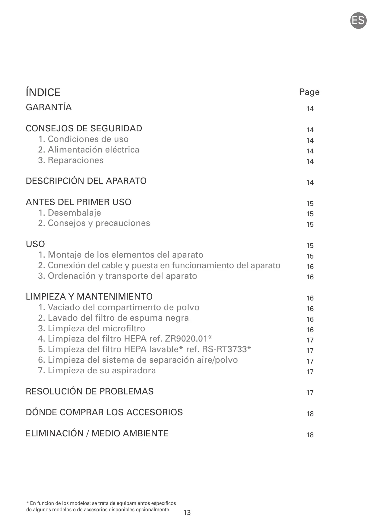 Pedal de Encendido / Apagado Pedal enrollador de cable Posición parking Ruedas Ruedecita multidireccional a - Emplazamiento del filtro HEPA b - Trampilla de acceso al filtro HEPA Filtro HEPA*, en función de los modelos a - Filtro HEPA* (ref ZR9020.01) b - Filtro HEPA* lavable (ref RS-RT3733) 18 Casete de filtración (ref RS-RT3732) a – Filtro de espuma negra b – Microfiltro 19 Sistema de presencia del casete de filtración (18)