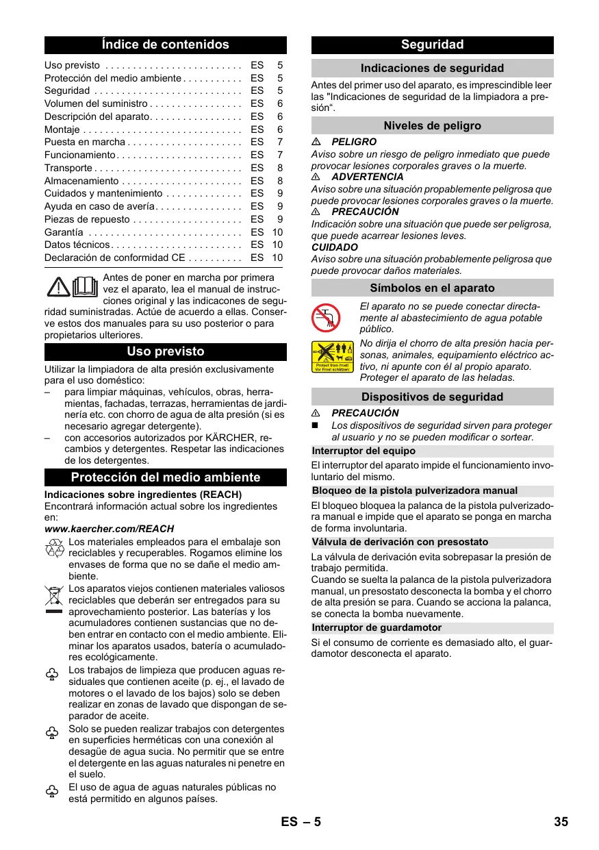 Indicaciones sobre ingredientes (REACH) Encontrará información actual sobre los ingredientes en: www.kaercher.com/REACH Los materiales empleados para el embalaje son reciclables y recuperables. Rogamos elimine los envases de forma que no se dañe el medio ambiente. Los aparatos viejos contienen materiales valiosos reciclables que deberán ser entregados para su aprovechamiento posterior. Las baterías y los acumuladores contienen sustancias que no deben entrar en contacto con el medio ambiente. Eliminar los aparatos usados, batería o acumuladores ecológicamente. Los trabajos de limpieza que producen aguas residuales que contienen aceite (p. ej., el lavado de motores o el lavado de los bajos) solo se deben realizar en zonas de lavado que dispongan de separador de aceite. Solo se pueden realizar trabajos con detergentes en superficies herméticas con una conexión al desagüe de agua sucia. No permitir que se entre el detergente en las aguas naturales ni penetre en el suelo. El uso de agua de aguas naturales públicas no está permitido en algunos países.