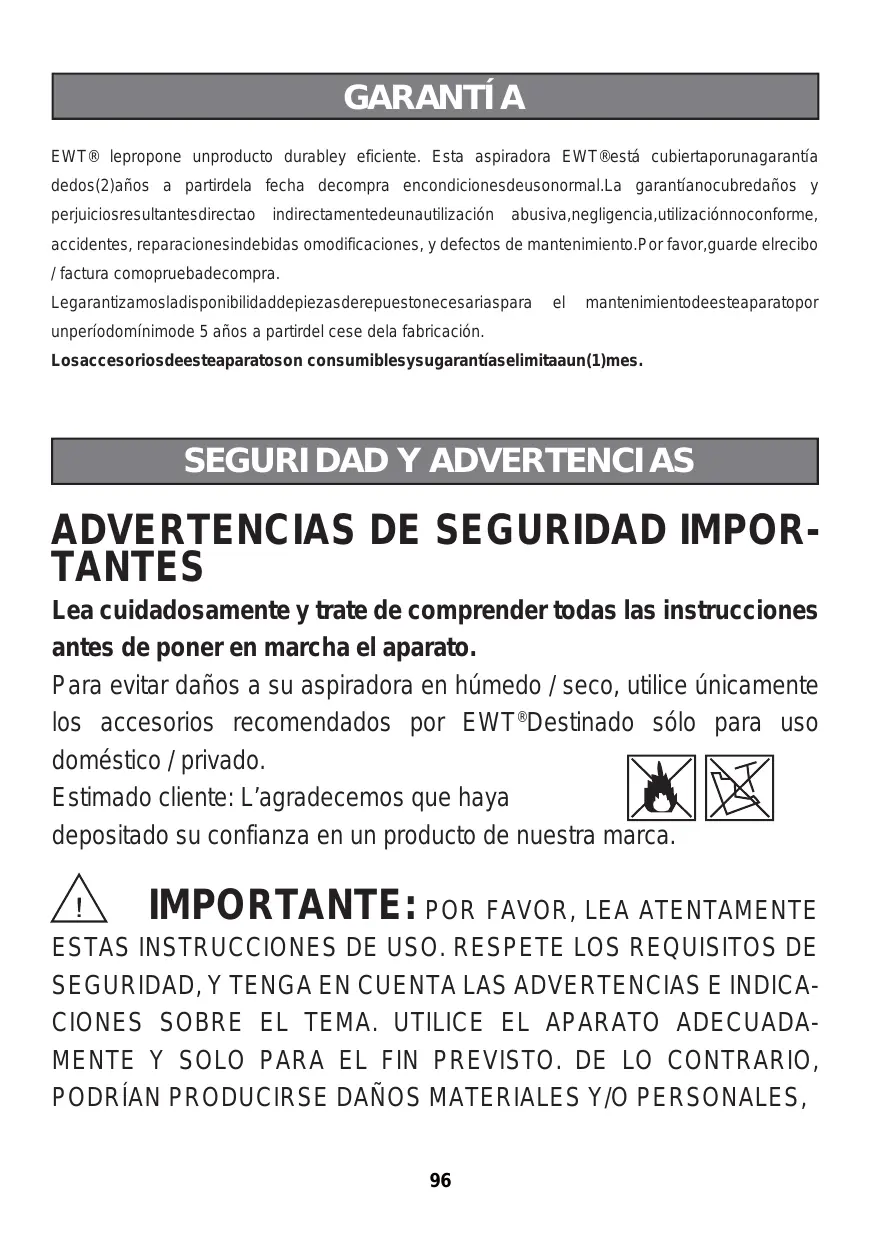 Lea cuidadosamente y trate de comprender todas las instrucciones antes de poner en marcha el aparato. Para evitar daños a su aspiradora en húmedo / seco, utilice únicamente los accesorios recomendados por EWT®Destinado sólo para uso doméstico / privado. Estimado cliente: L’agradecemos que haya depositado su confianza en un producto de nuestra marca.