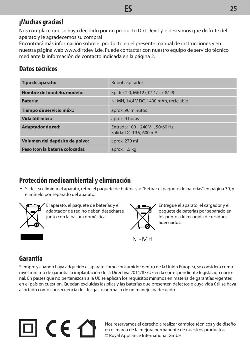 Nos complace que se haya decidido por un producto Dirt Devil. ¡Le deseamos que disfrute del aparato y le agradecemos su compra! Encontrará más información sobre el producto en el presente manual de instrucciones y en nuestra página web www.dirtdevil.de. Puede contactar con nuestro equipo de servicio técnico mediante la información de contacto indicada en la página 2.