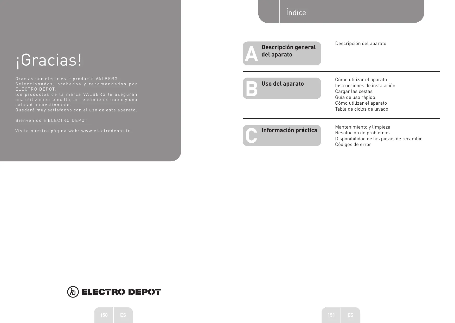 Descripción del aparato Descripción general del aparato Uso del aparato Información práctica Cómo utilizar el aparato Instrucciones de instalación Cargar las cestas Guía de uso rápido Cómo utilizar el aparato Tabla de ciclos de lavado Mantenimiento y limpieza Resolución de problemas Disponibilidad de las piezas de recambio Códigos de error