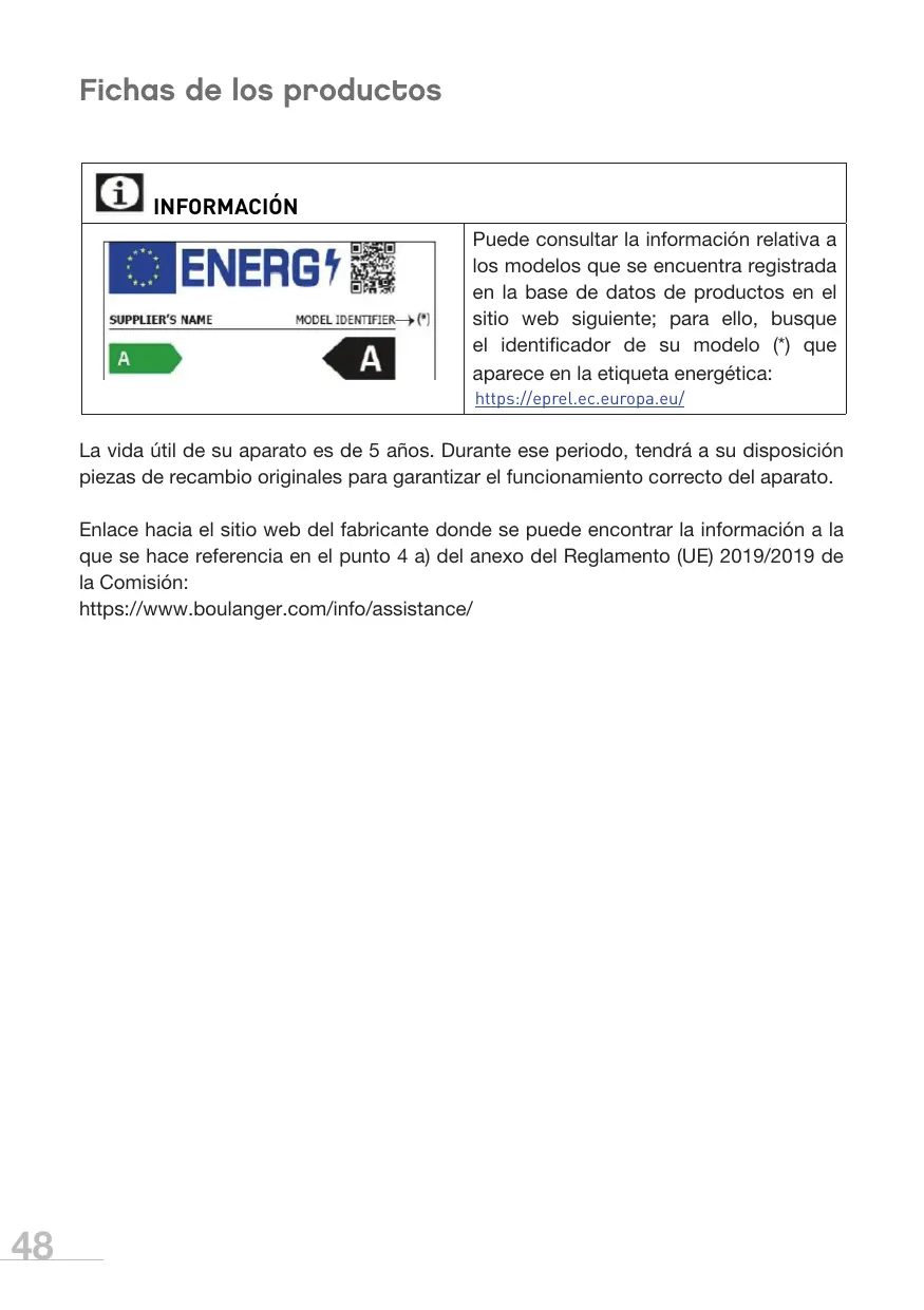 Balconnet portebouteilles Bottle shelf Estante portabotellas Tür-Flaschenhalterung Flessenrek fiches produits Fichas de los productos INFORMACIÓN Puede consultar la información relativa a los modelos que se encuentra registrada en la base de datos de productos en el sitio web siguiente; para ello, busque el identificador de su modelo (*) que aparece en la etiqueta energética: https://eprel.ec.europa.eu/ La vida útil de su aparato es de 5 años. Durante ese periodo, tendrá a su disposición piezas de recambio originales para garantizar el funcionamiento correcto del aparato. Enlace hacia el sitio web del fabricante donde se puede encontrar la información a la que se hace referencia en el punto 4 a) del anexo del Reglamento (UE) 2019/2019 de la Comisión: https://www.boulanger.com/info/assistance/