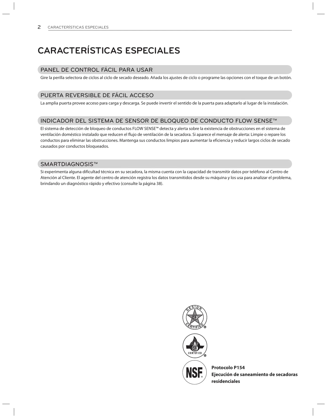 CARACTERÍSTICAS ESPECIALES CARACTERÍSTICAS ESPECIALES PANEL DE CONTROL FÁCIL PARA USAR Gire la perilla selectora de ciclos al ciclo de secado deseado. Añada los ajustes de ciclo o programe las opciones con el toque de un botón.