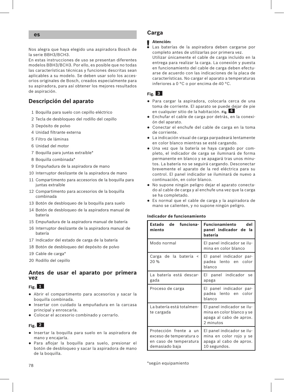 Nos alegra que haya elegido una aspiradora Bosch de la serie BBH3/BCH3. En estas instrucciones de uso se presentan diferentes modelos BBH3/BCH3. Por ello, es posible que no todas las características técnicas y funciones descritas sean aplicables a su modelo. Se deben usar solo los accesorios originales de Bosch, creados especialmente para su aspiradora, para así obtener los mejores resultados de aspiración. Descripción del aparato 1 Boquilla para suelo con cepillo eléctrico 2 Tecla de desbloqueo del rodillo del cepillo 3 Depósito de polvo 4 Unidad filtrante externa 5 Filtro de láminas 6 Unidad del motor 7 Boquilla para juntas extraíble* Carga