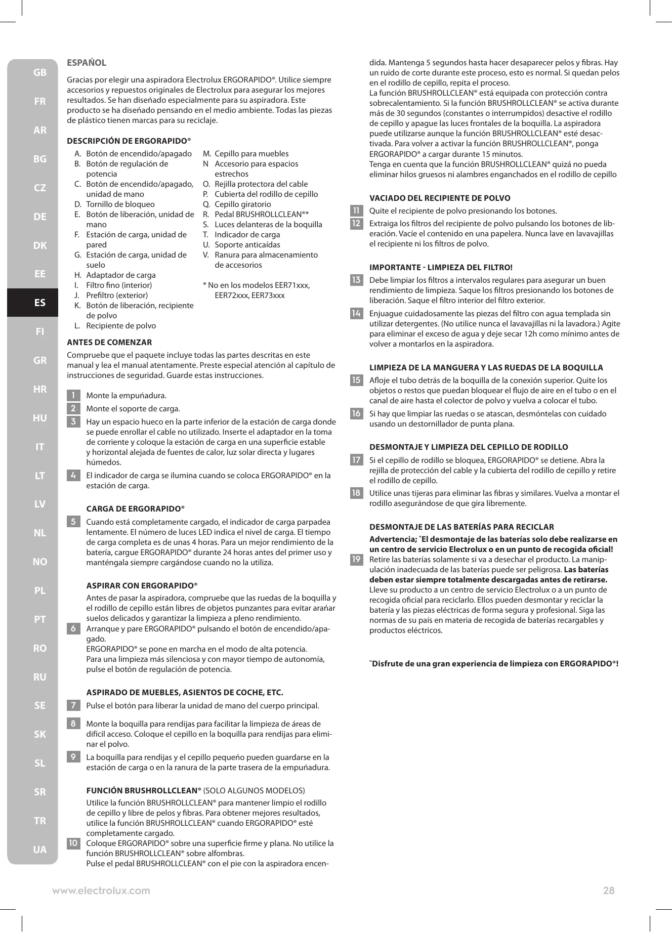 ESPAŃOL Gracias por elegir una aspiradora Electrolux ERGORAPIDO®. Utilice siempre accesorios y repuestos originales de Electrolux para asegurar los mejores resultados. Se han diseńado especialmente para su aspiradora. Este producto se ha diseńado pensando en el medio ambiente. Todas las piezas de plástico tienen marcas para su reciclaje. DESCRIPCIÓN DE ERGORAPIDO® A. Botón de encendido/apagado B. Botón de regulación de potencia C. Botón de encendido/apagado, unidad de mano D. Tornillo de bloqueo E. Botón de liberación, unidad de mano F. Estación de carga, unidad de pared G. Estación de carga, unidad de suelo H. Adaptador de carga I. Filtro fino (interior) J. Prefiltro (exterior) K. Botón de liberación, recipiente de polvo L. Recipiente de polvo