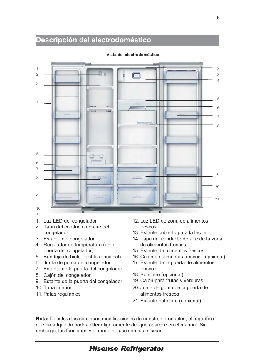 Nota: Debido a las continuas modificaciones de nuestros productos, el frigorífico que ha adquirido podría diferir ligeramente del que aparece en el manual. Sin embargo, las funciones y el modo de uso son las mismas.