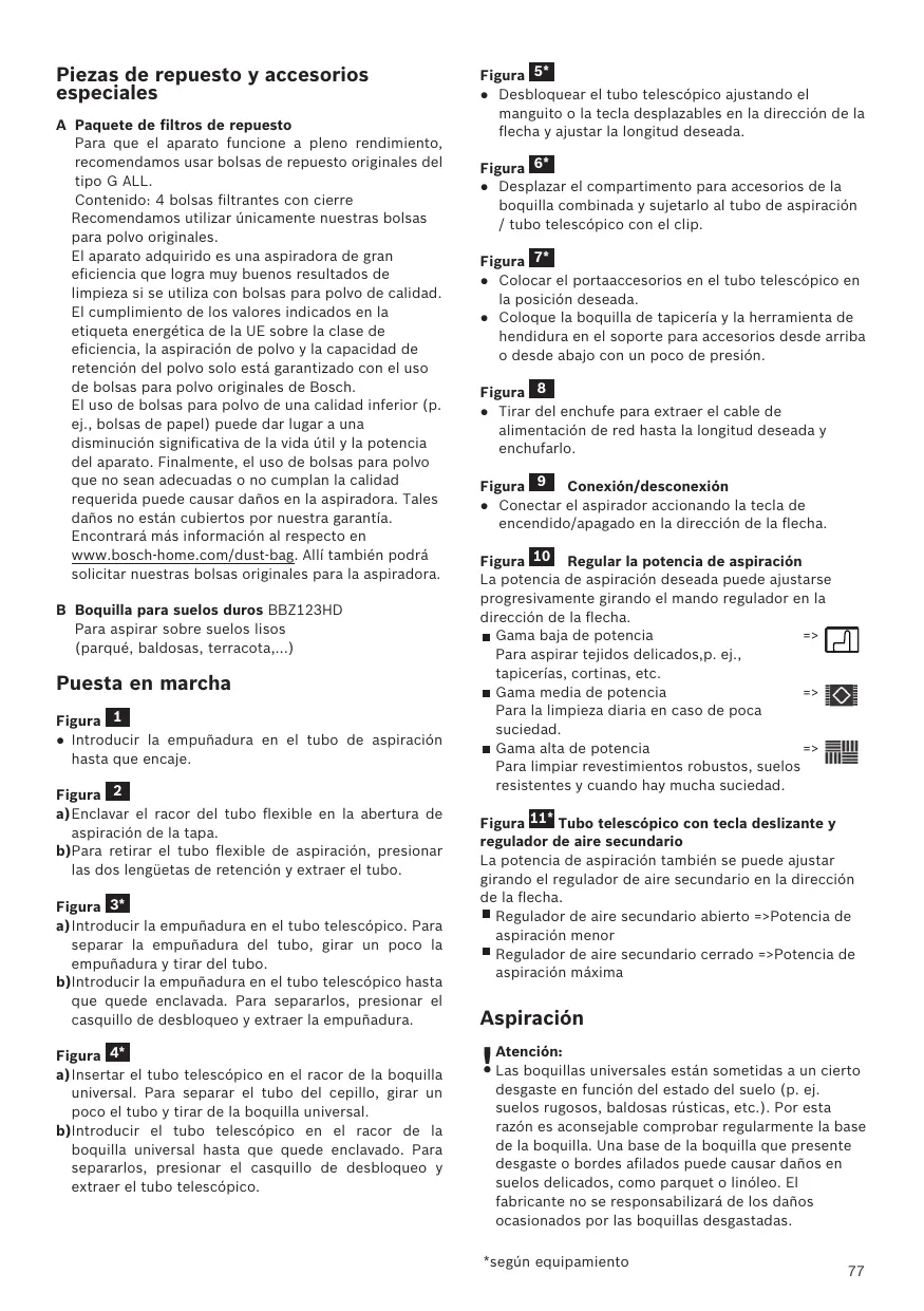 Nos alegra que haya elegido un aspirador Bosch de la serie BGLS40. En estas instrucciones de uso se presentan diferentes modelos BGLS40. Por ello, es posible que no todas las características técnicas y funciones descritas sean aplicables a su modelo. Se deben usar solo los accesorios originales de Bosch, creados especialmente para su aspirador, con el fin de obtener los mejores resultados de aspiración. Conservar las instrucciones de uso. En caso de entregar el aspirador a una tercera persona, adjuntar las instrucciones de uso. Abrir los desplegables laterales Descripción de los aparatos 1 Boquilla universal con dos posiciones, (con casquillo de desbloqueo)* 2 Tubo telescópico con tecla deslizante y regulador de aire secundario* 3 Boquilla para suelos duros (con casquillo de desbloqueo)* 4 Empuñadura del tubo* 5 Tubo flexible de aspiración 6 Tubo telescópico con tecla desplazable (y casquillo de desbloqueo)* 7 Tubo telescópico con manguito desplazable (y casquillo de desbloqueo)* 8 Cable de alimentación de red 9 Soporte para el tubo 10 Pestaña de cierre 11 Rejilla de salida 12 Bolsa filtrante 13 Filtro de salida* 14 Filtro protector del motor, lavable 15 Asa de transporte 16 Tapa del compartimento general 17 Indicador de cambio de filtro* 18 Soporte para el tubo en posición vertical (en la parte inferior del aparato) 19 Tecla de conexión/desconexión y regulador de potencia 20 Boquilla para juntas* 21 Boquilla para tapicería* 22 Boquilla combinada* 23 Portaaccesorios* 24 Boquilla para taladros* 25 Trampa para juguetes* *según equipamiento Piezas de repuesto y accesorios especiales A Paquete de filtros de repuesto Para que el aparato funcione a pleno rendimiento, recomendamos usar bolsas de repuesto originales del tipo G ALL. Contenido: 4 bolsas filtrantes con cierre Recomendamos utilizar únicamente nuestras bolsas para polvo originales. El aparato adquirido es una aspiradora de gran eficiencia que logra muy buenos resultados de limpieza si se utiliza con bolsas para polvo de calidad. El cumplimiento de los valores indicados en la etiqueta energética de la UE sobre la clase de eficiencia, la aspiración de polvo y la capacidad de retención del polvo solo está garantizado con el uso de bolsas para polvo originales de Bosch. El uso de bolsas para polvo de una calidad inferior (p. ej., bolsas de papel) puede dar lugar a una disminución significativa de la vida útil y la potencia del aparato. Finalmente, el uso de bolsas para polvo que no sean adecuadas o no cumplan la calidad requerida puede causar daños en la aspiradora. Tales daños no están cubiertos por nuestra garantía. Encontrará más información al respecto en www.bosch-home.com/dust-bag. Allí también podrá solicitar nuestras bolsas originales para la aspiradora. B Boquilla para suelos duros BBZ123HD Para aspirar sobre suelos lisos (parqué, baldosas, terracota,...) Puesta en marcha Figura 1 ● Introducir la empuñadura en el tubo de aspiración hasta que encaje. Figura 2 a)Enclavar el racor del tubo flexible en la abertura de aspiración de la tapa. b)Para retirar el tubo flexible de aspiración, presionar las dos lengüetas de retención y extraer el tubo. Figura 3* a)Introducir la empuñadura en el tubo telescópico. Para separar la empuñadura del tubo, girar un poco la empuñadura y tirar del tubo. b)Introducir la empuñadura en el tubo telescópico hasta que quede enclavada. Para separarlos, presionar el casquillo de desbloqueo y extraer la empuñadura. Figura 4* a)Insertar el tubo telescópico en el racor de la boquilla universal. Para separar el tubo del cepillo, girar un poco el tubo y tirar de la boquilla universal. b)Introducir el tubo telescópico en el racor de la boquilla universal hasta que quede enclavado. Para separarlos, presionar el casquillo de desbloqueo y extraer el tubo telescópico. Figura 5* ● Desbloquear el tubo telescópico ajustando el manguito o la tecla desplazables en la dirección de la flecha y ajustar la longitud deseada. Figura 6* ● Desplazar el compartimento para accesorios de la boquilla combinada y sujetarlo al tubo de aspiración / tubo telescópico con el clip. Figura 7* ● Colocar el portaaccesorios en el tubo telescópico en la posición deseada. ● Coloque la boquilla de tapicería y la herramienta de hendidura en el soporte para accesorios desde arriba o desde abajo con un poco de presión. Figura 8 ● Tirar del enchufe para extraer el cable de alimentación de red hasta la longitud deseada y enchufarlo. Figura 9 Conexión/desconexión ● Conectar el aspirador accionando la tecla de encendido/apagado en la dirección de la flecha. Figura 10 Regular la potencia de aspiración La potencia de aspiración deseada puede ajustarse progresivamente girando el mando regulador en la dirección de la flecha. Gama baja de potencia Para aspirar tejidos delicados,p. ej., tapicerías, cortinas, etc. Gama media de potencia Para la limpieza diaria en caso de poca suciedad. Gama alta de potencia Para limpiar revestimientos robustos, suelos resistentes y cuando hay mucha suciedad. Figura 11* Tubo telescópico con tecla deslizante y regulador de aire secundario La potencia de aspiración también se puede ajustar girando el regulador de aire secundario en la dirección de la flecha. Regulador de aire secundario abierto =>Potencia de aspiración menor Regulador de aire secundario cerrado =>Potencia de aspiración máxima Aspiración ! Atención: Las boquillas universales están sometidas a un cierto desgaste en función del estado del suelo (p. ej. suelos rugosos, baldosas rústicas, etc.). Por esta razón es aconsejable comprobar regularmente la base de la boquilla. Una base de la boquilla que presente desgaste o bordes afilados puede causar daños en suelos delicados, como parquet o linóleo. El fabricante no se responsabilizará de los daños ocasionados por las boquillas desgastadas. *según equipamiento