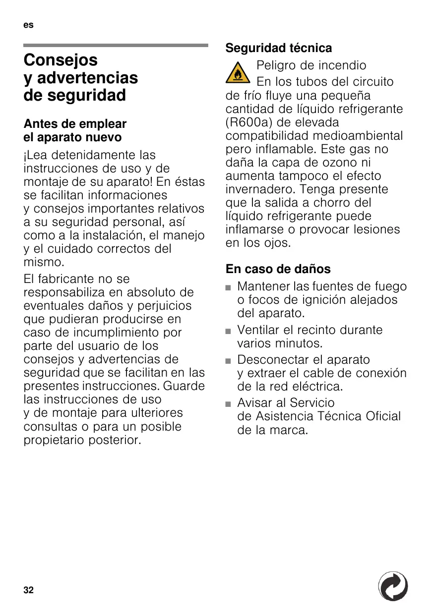 Seguridad técnica Peligro de incendio En los tubos del circuito de frío fluye una pequeña cantidad de líquido refrigerante (R600a) de elevada compatibilidad medioambiental pero inflamable. Este gas no daña la capa de ozono ni aumenta tampoco el efecto invernadero. Tenga presente que la salida a chorro del líquido refrigerante puede inflamarse o provocar lesiones en los ojos. En caso de daños ■ Mantener las fuentes de fuego o focos de ignición alejados del aparato. ■ Ventilar el recinto durante varios minutos. ■ Desconectar el aparato y extraer el cable de conexión de la red eléctrica. ■ Avisar al Servicio de Asistencia Técnica Oficial de la marca.