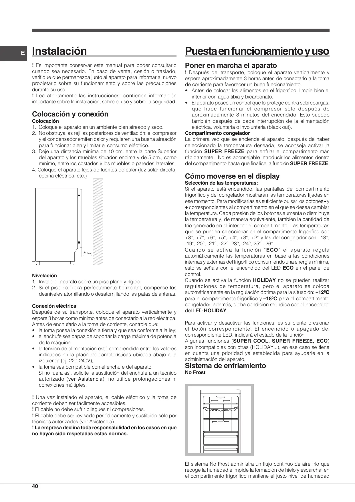 Colocación 1. Coloque el aparato en un ambiente bien aireado y seco. 2. No obstruya las rejillas posteriores de ventilación: el compresor y el condensador emiten calor y requieren una buena aireación para funcionar bien y limitar el consumo eléctrico. 3. Deje una distancia mínima de 10 cm. entre la parte Superior del aparato y los muebles situados encima y de 5 cm., como mínimo, entre los costados y los muebles o paredes laterales. 4. Coloque el aparato lejos de fuentes de calor (luz solar directa, cocina eléctrica, etc.)