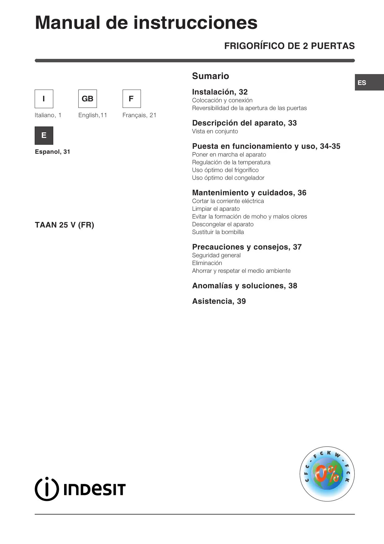 MANUAL DE USUARIO TAAN 25 V INDESIT