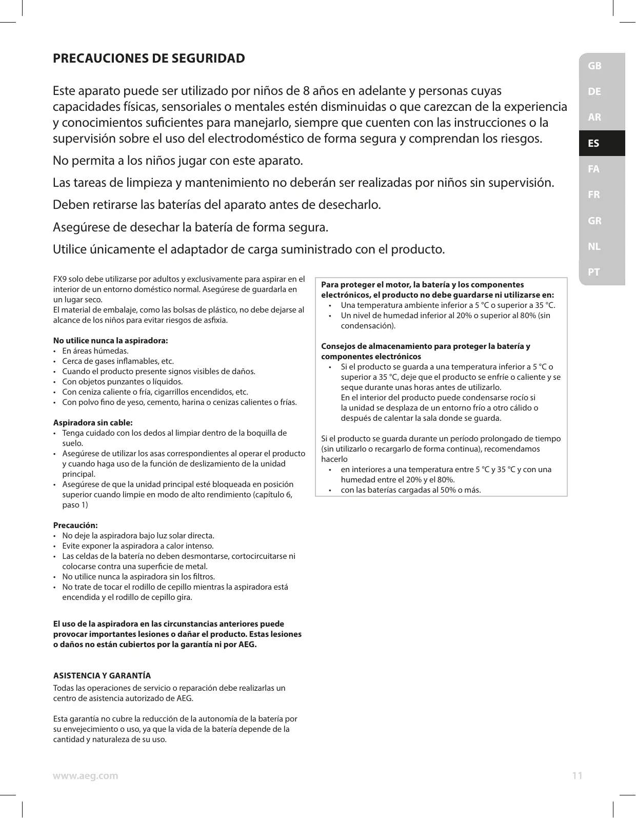 • No deje la aspiradora bajo luz solar directa. • Evite exponer la aspiradora a calor intenso. • Las celdas de la batería no deben desmontarse, cortocircuitarse ni colocarse contra una superficie de metal. • No utilice nunca la aspiradora sin los filtros. • No trate de tocar el rodillo de cepillo mientras la aspiradora está encendida y el rodillo de cepillo gira. El uso de la aspiradora en las circunstancias anteriores puede provocar importantes lesiones o dañar el producto. Estas lesiones o daños no están cubiertos por la garantía ni por AEG. ASISTENCIA Y GARANTÍA Todas las operaciones de servicio o reparación debe realizarlas un centro de asistencia autorizado de AEG. Esta garantía no cubre la reducción de la autonomía de la batería por su envejecimiento o uso, ya que la vida de la batería depende de la cantidad y naturaleza de su uso.