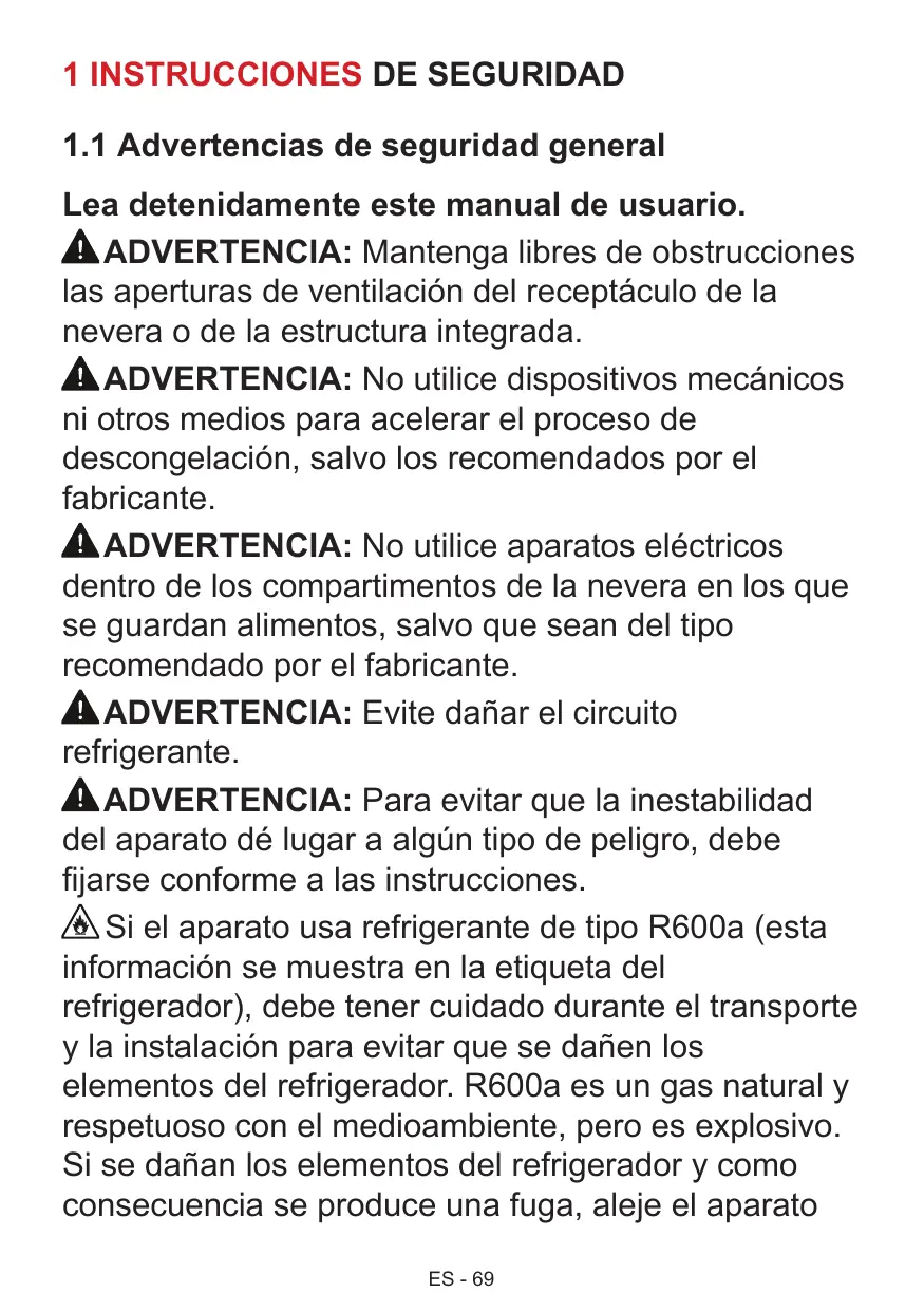 1.1 Advertencias de seguridad general Lea detenidamente este manual de usuario. ADVERTENCIA: Mantenga libres de obstrucciones las aperturas de ventilación del receptáculo de la nevera o de la estructura integrada. ADVERTENCIA: No utilice dispositivos mecánicos ni otros medios para acelerar el proceso de descongelación, salvo los recomendados por el fabricante. ADVERTENCIA: No utilice aparatos eléctricos dentro de los compartimentos de la nevera en los que se guardan alimentos, salvo que sean del tipo recomendado por el fabricante. ADVERTENCIA: Evite dañar el circuito refrigerante. ADVERTENCIA: Para evitar que la inestabilidad del aparato dé lugar a algún tipo de peligro, debe fijarse conforme a las instrucciones. Si el aparato usa refrigerante de tipo R600a (esta información se muestra en la etiqueta del refrigerador), debe tener cuidado durante el transporte y la instalación para evitar que se dañen los elementos del refrigerador. R600a es un gas natural y respetuoso con el medioambiente, pero es explosivo. Si se dañan los elementos del refrigerador y como consecuencia se produce una fuga, aleje el aparato ES - 69