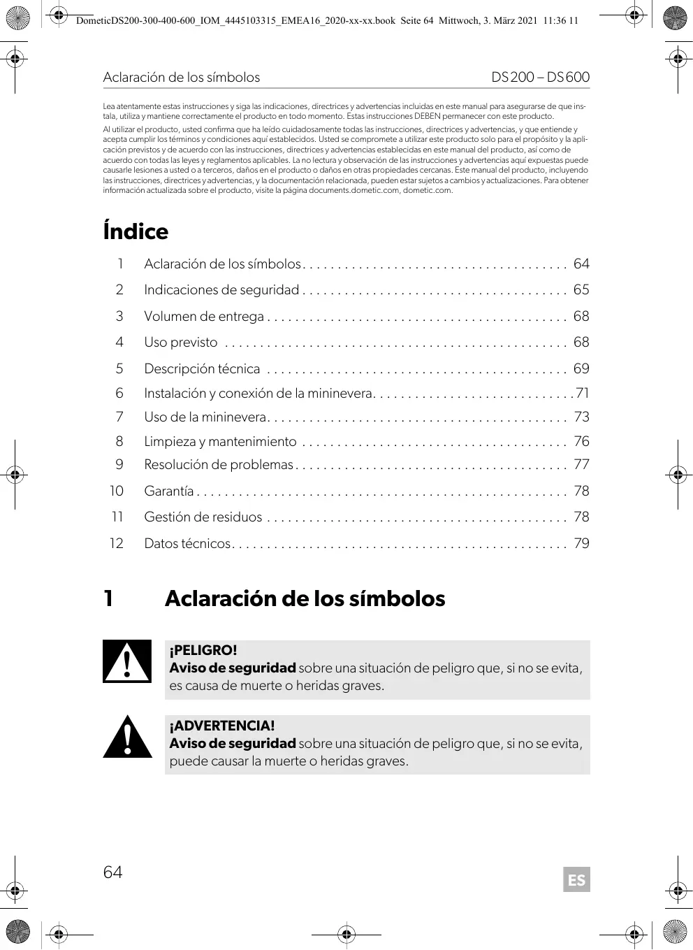 Al utilizar el producto, usted confirma que ha leído cuidadosamente todas las instrucciones, directrices y advertencias, y que entiende y acepta cumplir los términos y condiciones aquí establecidos. Usted se compromete a utilizar este producto solo para el propósito y la aplicación previstos y de acuerdo con las instrucciones, directrices y advertencias establecidas en este manual del producto, así como de acuerdo con todas las leyes y reglamentos aplicables. La no lectura y observación de las instrucciones y advertencias aquí expuestas puede causarle lesiones a usted o a terceros, daños en el producto o daños en otras propiedades cercanas. Este manual del producto, incluyendo las instrucciones, directrices y advertencias, y la documentación relacionada, pueden estar sujetos a cambios y actualizaciones. Para obtener información actualizada sobre el producto, visite la página documents.dometic.com, dometic.com.