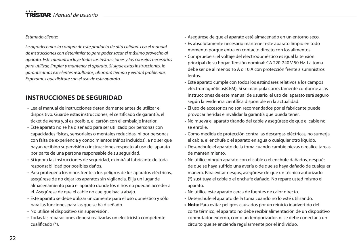 - Tristar no será responsable de los daños materiales o lesiones personales causados por un uso incorrecto o si no se respetan las instrucciones de seguridad.