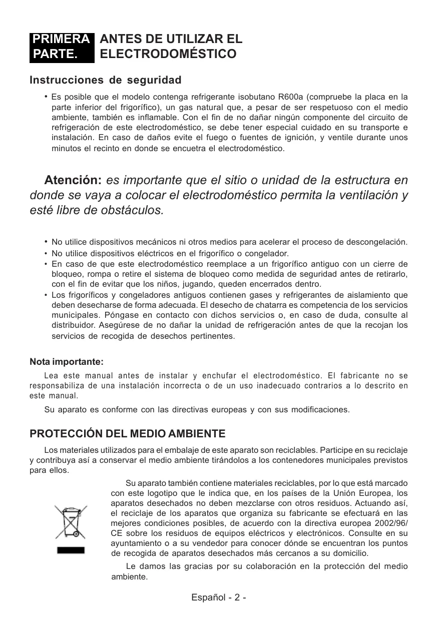 PRIMERA ANTES DE UTILIZAR EL PARTE. ELECTRODOMÉSTICO Instrucciones de seguridad • Es posible que el modelo contenga refrigerante isobutano R600a (compruebe la placa en la parte inferior del frigorífico), un gas natural que, a pesar de ser respetuoso con el medio ambiente, también es inflamable. Con el fin de no dañar ningún componente del circuito de refrigeración de este electrodoméstico, se debe tener especial cuidado en su transporte e instalación. En caso de daños evite el fuego o fuentes de ignición, y ventile durante unos minutos el recinto en donde se encuetra el electrodoméstico.
