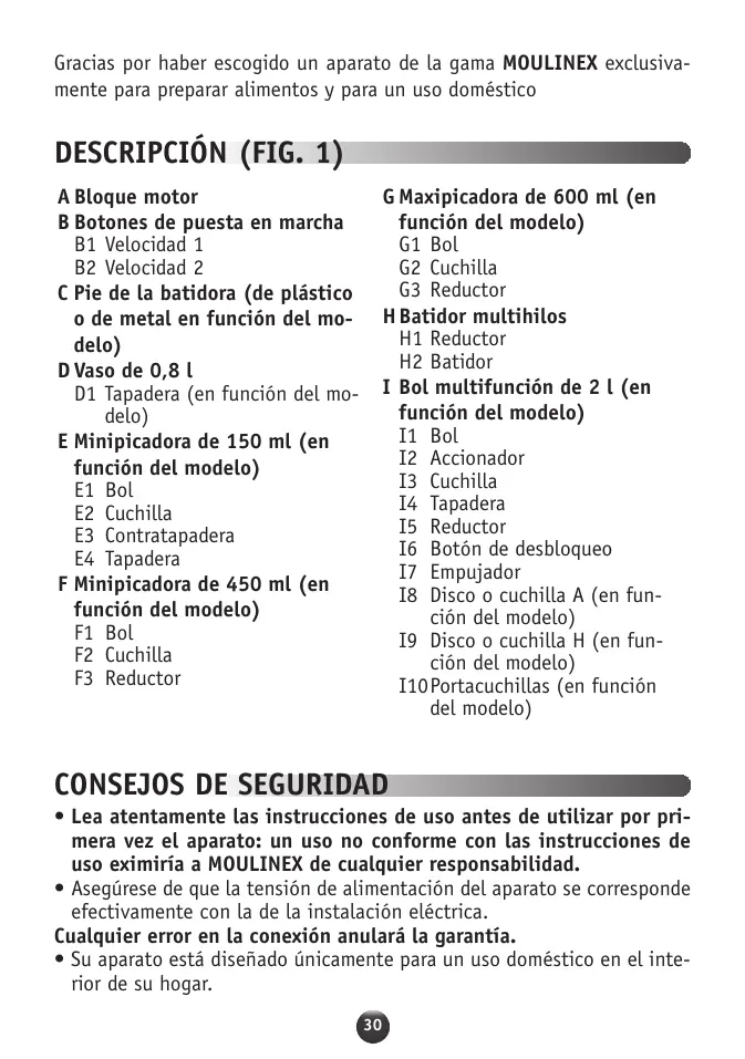 Gracias por haber escogido un aparato de la gama MOULINEX exclusivamente para preparar alimentos y para un uso doméstico DESCRIPCIÓN (FIG. 1) A Bloque motor B Botones de puesta en marcha B1 Velocidad 1 B2 Velocidad 2 C Pie de la batidora (de plástico o de metal en función del modelo) D Vaso de 0,8 l D1 Tapadera (en función del modelo) E Minipicadora de 150 ml (en función del modelo) E1 Bol E2 Cuchilla E3 Contratapadera E4 Tapadera F Minipicadora de 450 ml (en función del modelo) F1 Bol F2 Cuchilla F3 Reductor G Maxipicadora de 600 ml (en función del modelo) G1 Bol G2 Cuchilla G3 Reductor H Batidor multihilos H1 Reductor H2 Batidor I Bol multifunción de 2 l (en función del modelo) I1 Bol I2 Accionador I3 Cuchilla I4 Tapadera I5 Reductor I6 Botón de desbloqueo I7 Empujador I8 Disco o cuchilla A (en función del modelo) I9 Disco o cuchilla H (en función del modelo) I10Portacuchillas (en función del modelo)