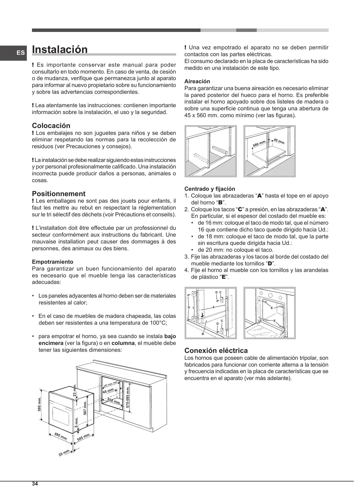 Instalación ! Es importante conservar este manual para poder consultarlo en todo momento. En caso de venta, de cesión o de mudanza, verifique que permanezca junto al aparato para informar al nuevo propietario sobre su funcionamiento y sobre las advertencias correspondientes. ! Lea atentamente las instrucciones: contienen importante información sobre la instalación, el uso y la seguridad. ! Una vez empotrado el aparato no se deben permitir contactos con las partes eléctricas. El consumo declarado en la placa de características ha sido medido en una instalación de este tipo. Aireación Para garantizar una buena aireación es necesario eliminar la pared posterior del hueco para el horno. Es preferible instalar el horno apoyado sobre dos listeles de madera o sobre una superficie continua que tenga una abertura de 45 x 560 mm. como mínimo (ver las figuras). Colocación ! Los embalajes no son juguetes para niños y se deben eliminar respetando las normas para la recolección de residuos (ver Precauciones y consejos).