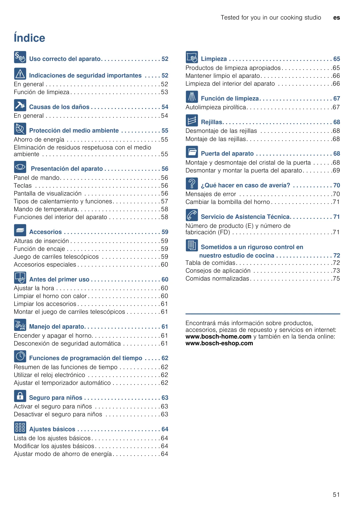 - Encontrará más información sobre productos, accesorios, piezas de repuesto y servicios en internet: www.bosch-home.com y también en la tienda online: www.bosch-eshop.com O Funciones de programación del tiempo p. 62