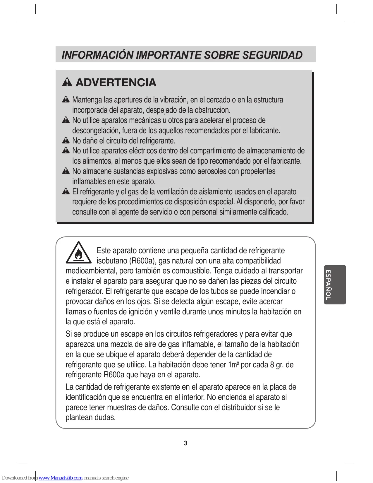 INFORMACIÓN IMPORTANTE SOBRE SEGURIDAD 2. Al utilizar el refrigerador Si se produce un escape de gas, no toque el refrigerador ni la toma de corriente y ventile la habitación de inmediato. • Una chispa podría provocar un incendio en ese caso. • Debido a que el refrigerador utiliza gas natural (isobuteno, R600a) como refrigerante respetuoso con el medio ambiente, incluso una pequeña cantidad (80-90g) es inflamable. Si se produce un escape de gas debido a daños graves durante la entrega, la instalación, o durante la utilización del aparato, una sola chispa podría provocar un incendio.