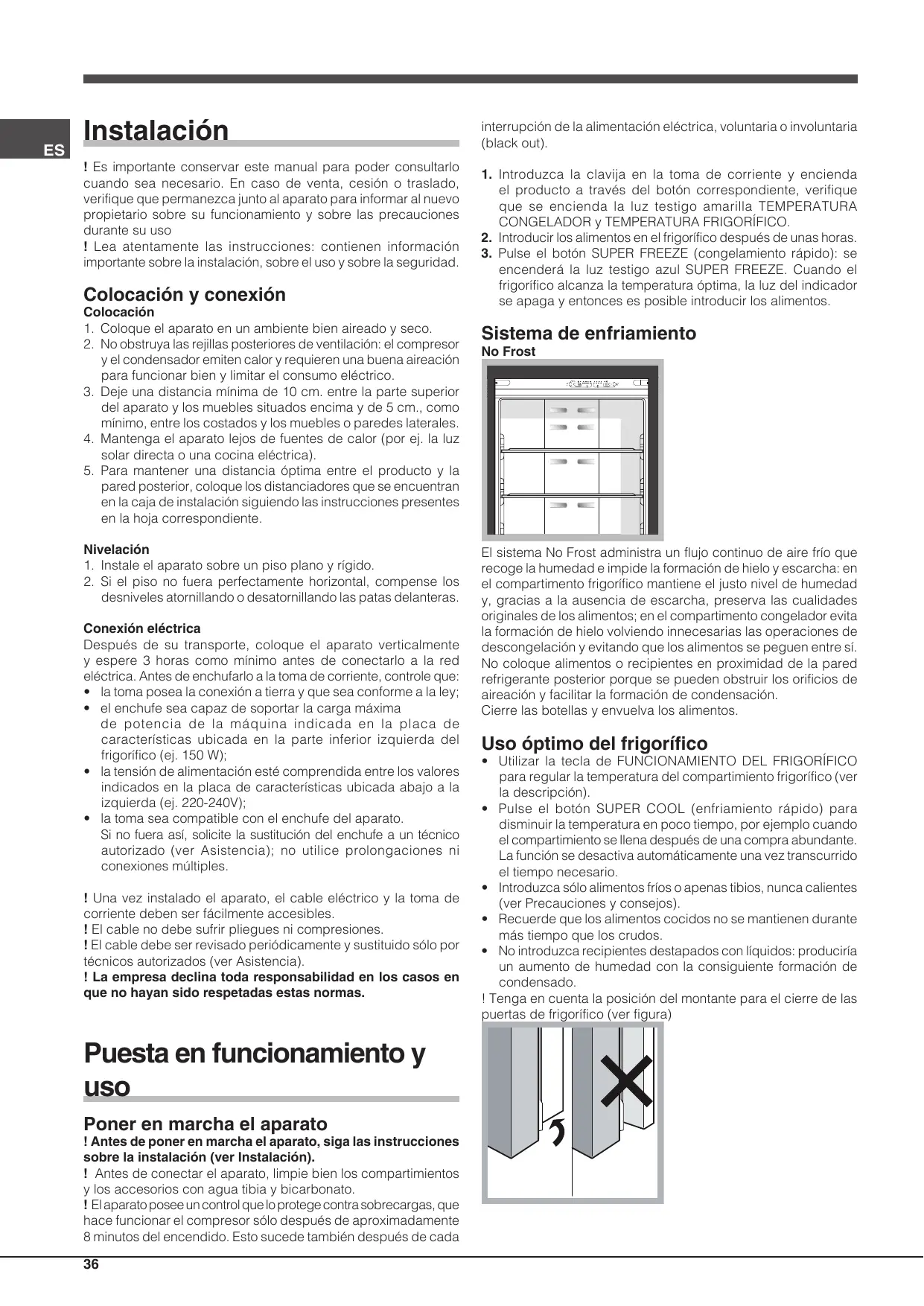 De etenswaren in de koelkast bevriezen. • De temperatuur is niet goed afgesteld (zie beschrijving) • De levensmiddelen bevinden zich vlakbij de ventilatieopeningen. De motor blijft doorlopend draaien • De knop SUPERVRIEZEN is ingedrukt (snel invriezen): het blauwe lichtje van SNELVRIEZEN is aan of knippert (zie Beschrijving). • De deur is niet goed dicht of wordt constant geopend. • De buitentemperatuur is erg hoog. • la tensión de alimentación esté comprendida entre los valores indicados en la placa de características ubicada abajo a la izquierda (ej. 220-240V); • la toma sea compatible con el enchufe del aparato. Si no fuera así, solicite la sustitución del enchufe a un técnico autorizado (ver Asistencia); no utilice prolongaciones ni conexiones múltiples. ! Una vez instalado el aparato, el cable eléctrico y la toma de corriente deben ser fácilmente accesibles. ! El cable no debe sufrir pliegues ni compresiones. 3. Controle nuevamente el indicador: si es necesario, realice una nueva regulación. Si se han introducido grandes cantidades de alimentos o si se ha abierto frecuentemente la puerta del frigorífico, es normal que el indicador no marque OK. Espere 10 h como mínimo antes de llevar el mando de FUNCIONAMIENTO DEL FRIGORÍFICO hasta una posición más alta. Recipiente FRUTA y VERDURA* Es posible modificar la temperatura pulsando los botones de regulación.La optimización del consumo se obtendrá después de 48 hs. de activada la función. Para desactivar la función I Care, apague el producto (Ver la descripción). El producto se puede encender nuevamente para su normal funcionamiento. En ambientes húmedos, con la función I Care activada, podría presentarse una leve formación de condensación en las puertas; desactivando la función se restablecen las condiciones estándares del aparato.