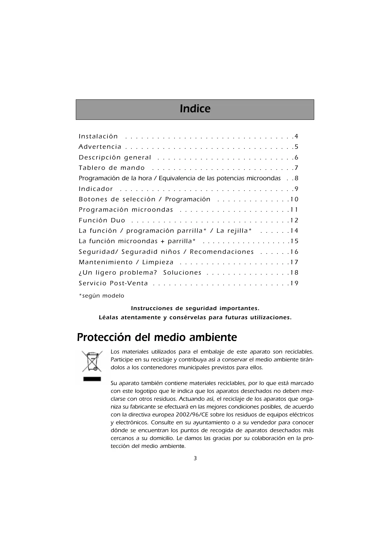 Servicio Post-Venta . . . . . . . . . . . . . . . . . . . . . . . . . .19 *según modelo Instrucciones de seguridad importantes. Léalas atentamente y consérvelas para futuras utilizaciones.
