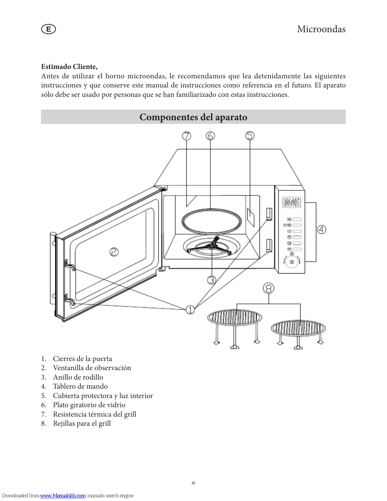 Tablero de mando Cubierta protectora y luz interior Plato giratorio de vidrio Resistencia térmica del grill Rejillas para el grill  Debe asegurar una ventilación suficiente en todo momento. No coloque objetos encima de la unidad, y asegúrese de mantener las siguientes distancias mínimas respecto a la pared u otro objeto: Lateral: Antes de usarlo por primera vez  Retire todos los materiales de embalaje externos e internos. Todos estos materiales están indicados para el reciclaje.  No retire la capa protectora que cubre el interior de la puerta, ni la cubierta protectora grismarrón (5) junto a la luz en el lado derecho del interior.  Precaución: mantenga a los niños alejados del material de embalaje, porque podría ser peligroso, existe el peligro de asfixia.  Después de desembalarlo y cada vez que conecte la unidad a la red eléctrica, examine el aparato y el cable de alimentación por si hubiera indicios de desperfectos. Asegúrese también de que la puerta (incluyendo la ventanilla de observación, el sellado de la puerta y los cierres) no está dañada o torcida y ciérrela firmemente contra su marco. Esto es importante porque asegura que no haya escapes de energía de microondas durante el funcionamiento. Por la misma razón debe examinar cuidadosamente la caja entera junto con el interior del horno. En caso de avería, este aparato no debe ser usado hasta que haya sido reparado por un técnico cualificado.  Este aparato podrá ser utilizado por niños (mayores de 8 años) solo cuando hayan recibido supervisión o instrucciones relativas al uso del aparato y comprendan totalmente el peligro y las precauciones de seguridad implicados. Esto también es aplicable a personas con reducidas facultades físicas, sensoriales o mentales, sin experiencia o conocimiento del aparato. Los niños no deben realizar ninguna tarea de limpieza o mantenimiento del aparato.  Los niños menores de 8 años deben mantenerse lejos del aparato y de su cable eléctrico mientras está conectado a la red eléctrica, o mientras el aparato se está enfriando después de haberlo utilizado.  Antes de utilizar el aparato por vez primera, o tras largos períodos de no utilización, se debe limpiar meticulosamente siguiendo las indicaciones de la sección Mantenimiento y Limpieza General.  Cuando se desenchufa la clavija de la pared, nunca tirar del cable de alimentación.  Atención: Las superficies exteriores del electrodoméstico pueden calentarse durante su funcionamiento. También existe peligro de emisión de vapor por las ranuras de ventilación: peligro de quemaduras.  No deje que el aparato o su cable de alimentación entren en contacto con superficies calientes o fuentes de calor. No permita que el cable de alimentación cuelgue en el vacío y manténgalo lejos de cosas calientes.  Si el aparato no se mantiene limpio, se producirá el deterioro de su superficie, y en consecuencia una reducción en la vida útil del aparato, además de constituir un peligro para la seguridad del usuario.  Este aparato ha sido diseñado para el uso doméstico u otra aplicación similar, por ejemplo - en oficinas y otros puntos comerciales, - en zonas agrícolas, - por los clientes de hoteles, pensiones, etc. y establecimientos similares, - en casas rurales.  Atención: cualquier trabajo de mantenimiento o reparación que precise la extracción de alguna cubierta protectora contra la radiación del microondas representa un serio peligro para personas no cualificadas. Esto incluye la sustitución del cable eléctrico o la bombilla del alumbrado interior. El aparato no debe ser abierto, excepto por personal cualificado. Si es preciso repararlo, se debe mandar el aparato a uno de nuestros servicios de asistencia postventa. Las direcciones se encuentran en el apéndice de este manual.  Este electrodoméstico es un aparato del grupo 2 de la clase B ISM. El grupo 2 incluye todos los aparatos ISM (industriales, científicos, médicos) que generan energía por radio frecuencia en forma de radiación electromagnética para el procesamiento de material; también incluye los aparatos de electroerosión. La clase B indica aparatos diseñados para el uso doméstico, o cualquier aparato similar integrado en las unidades domésticas de suministro eléctrico. La función microondas (Grupo II cumple con la norma EN 55011:1998+A1+A2) Dentro del aparato se genera energía electromagnética, haciendo que las moléculas de la comida (principalmente moléculas de agua) oscilen y por consiguiente que la comida se caliente. Por esta razón, la comida con un alto contenido de agua se calentará más rápidamente que la comida relativamente seca. El calor se propaga gradualmente dentro de la comida. Los utensilios, platos o recipientes que emplea solo se calientan indirectamente, como resultado del incremento de la temperatura de la comida. Emplee siempre utensilios de cocina apropiados  No coloque la comida directamente encima del plato giratorio de vidrio; emplee siempre un plato o un recipiente apropiado de cocina. Asegúrese de que el recipiente no sobresalga del borde del plato giratorio.  Debe evitarse el uso de objetos metálicos dado que las ondas se reflejan en las superficies metálicas, pudiendo no llegar hasta la comida que se desea cocinar. Cualquier metal dentro del horno podría generar chispas, y con ello un eventual daño al aparato.  Como regla general, los cubiertos o contenedores metálicos no deben ser usados en el microondas. Algunas envolturas de comida contienen aluminio doméstico o alambre bajo una capa de papel y por lo tanto tampoco son indicadas para el uso con los aparatos de microondas. 64 - Utilización de la función microondas - Sin embargo, los contenedores hechos de vidrio termorresistente o porcelana son muy adecuados para el uso en aparatos de microondas. - El plástico es apropiado solo si es termorresistente hasta 180° C. Las bolsas de cocinar etc. deb