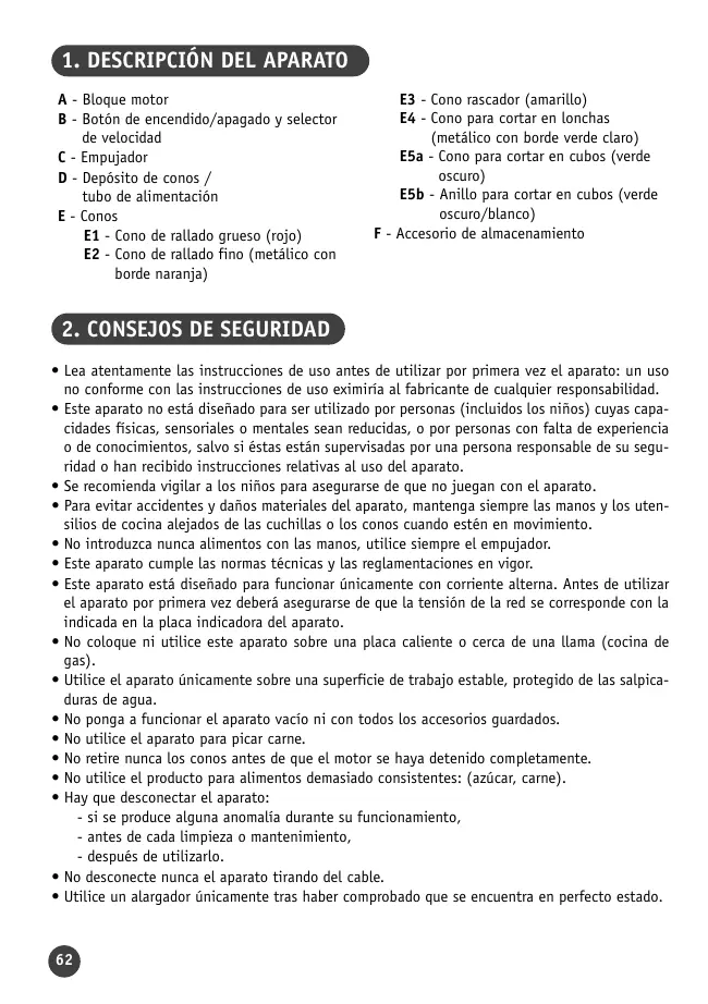 1. DESCRIPCIÓN DEL APARATO A - Bloque motor B - Botón de encendido/apagado y selector de velocidad C - Empujador D - Depósito de conos / tubo de alimentación E - Conos E1 - Cono de rallado grueso (rojo) E2 - Cono de rallado fino (metálico con borde naranja)
