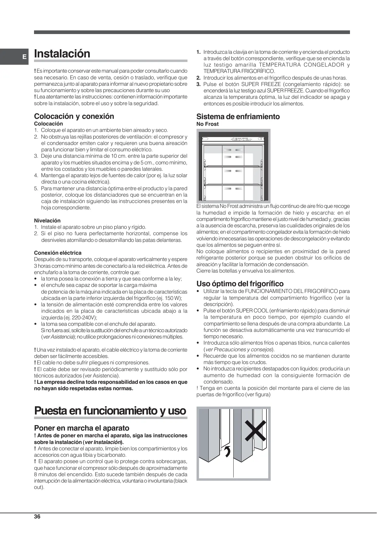 Poner en marcha el aparato ! Antes de poner en marcha el aparato, siga las instrucciones sobre la instalación (ver Instalación). ! Antes de conectar el aparato, limpie bien los compartimientos y los accesorios con agua tibia y bicarbonato. ! El aparato posee un control que lo protege contra sobrecargas, que hace funcionar el compresor sólo después de aproximadamente 8 minutos del encendido. Esto sucede también después de cada interrupción de la alimentación eléctrica, voluntaria o involuntaria (black out).