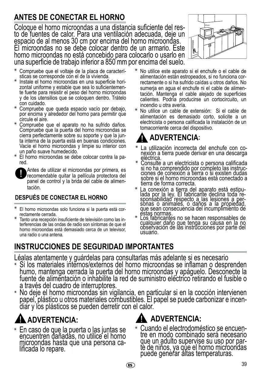 30cm 850mm Antes de conectar el horno Coloque el horno microondas a una distancia suficiente del resto de fuentes de calor. Para una ventilación adecuada, deje un espacio de al menos 30 cm por encima del horno microondas. El microondas no se debe colocar dentro de un armario. Este horno microondas no está concebido para colocarlo o usarlo en una superficie de trabajo inferior a 850 mm por encima del suelo. El horno microondas solo funciona si la puerta está correctamente cerrada. Tanto una recepción insuficiente de televisión como las interferencias de las ondas de radio son síntomas de que el horno microondas está demasiado cerca de un televisor, una radio o una antena.