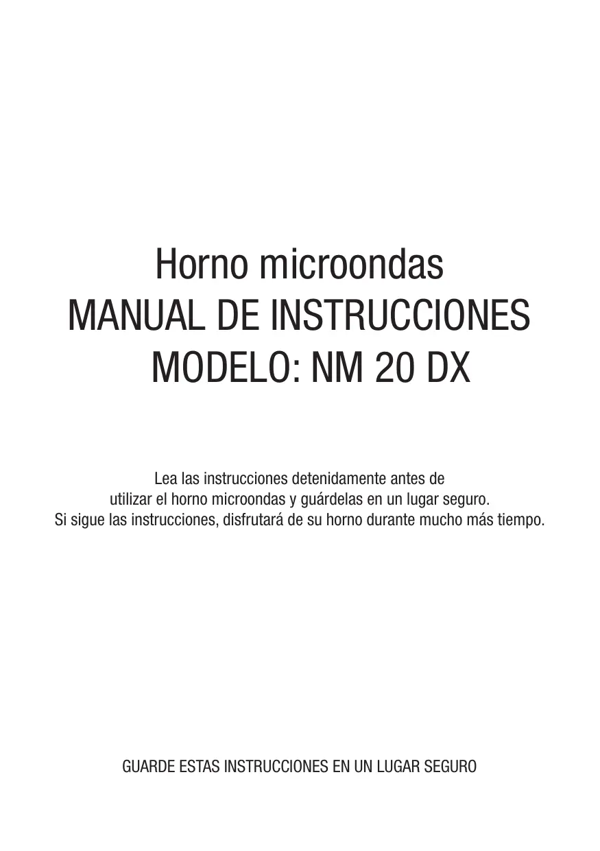 MANUAL DE INSTRUCCIONES MODELO: NM 20 DX Lea las instrucciones detenidamente antes de utilizar el horno microondas y guárdelas en un lugar seguro. Si sigue las instrucciones, disfrutará de su horno durante mucho más tiempo.