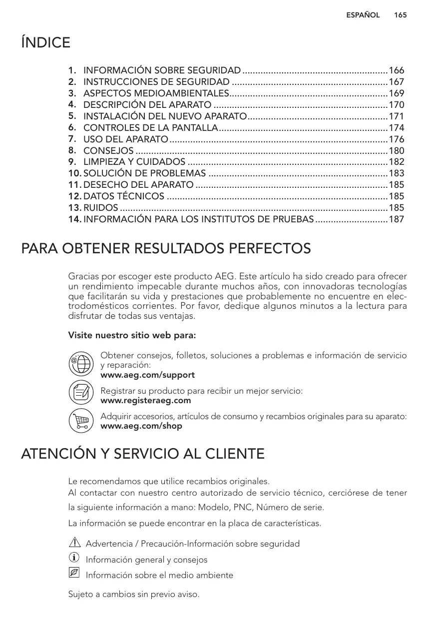 Gracias por escoger este producto AEG. Este artículo ha sido creado para ofrecer un rendimiento impecable durante muchos años, con innovadoras tecnologías que facilitarán su vida y prestaciones que probablemente no encuentre en electrodomésticos corrientes. Por favor, dedique algunos minutos a la lectura para disfrutar de todas sus ventajas. Visite nuestro sitio web para: Obtener consejos, folletos, soluciones a problemas e información de servicio y reparación: www.aeg.com/support Registrar su producto para recibir un mejor servicio: www.registeraeg.com Adquirir accesorios, artículos de consumo y recambios originales para su aparato: www.aeg.com/shop