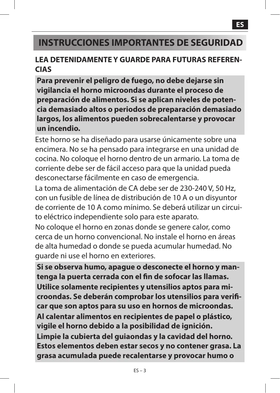 LEA DETENIDAMENTE Y GUARDE PARA FUTURAS REFERENCIAS Para prevenir el peligro de fuego, no debe dejarse sin vigilancia el horno microondas durante el proceso de preparación de alimentos. Si se aplican niveles de potencia demasiado altos o periodos de preparación demasiado largos, los alimentos pueden sobrecalentarse y provocar un incendio. Este horno se ha diseñado para usarse únicamente sobre una encimera. No se ha pensado para integrarse en una unidad de cocina. No coloque el horno dentro de un armario. La toma de corriente debe ser de fácil acceso para que la unidad pueda desconectarse fácilmente en caso de emergencia. La toma de alimentación de CA debe ser de 230-240 V, 50 Hz, con un fusible de línea de distribución de 10 A o un disyuntor de corriente de 10 A como mínimo. Se deberá utilizar un circuito eléctrico independiente solo para este aparato. No coloque el horno en zonas donde se genere calor, como cerca de un horno convencional. No instale el horno en áreas de alta humedad o donde se pueda acumular humedad. No guarde ni use el horno en exteriores. Si se observa humo, apague o desconecte el horno y mantenga la puerta cerrada con el fin de sofocar las llamas. Utilice solamente recipientes y utensilios aptos para microondas. Se deberán comprobar los utensilios para verificar que son aptos para su uso en hornos de microondas. Al calentar alimentos en recipientes de papel o plástico, vigile el horno debido a la posibilidad de ignición. Limpie la cubierta del guiaondas y la cavidad del horno. Estos elementos deben estar secos y no contener grasa. La grasa acumulada puede recalentarse y provocar humo o ES – 3 incendios. No coloque materiales inflamables cerca del horno o los orificios de ventilación. No bloquee los orificios de ventilación. Extraiga todos los sellos metálicos, cierres con alambre, etc., de los alimentos y de los alimentos envasados. Los arcos eléctricos en superficies metálicas pueden provocar incendios. No use el horno microondas para calentar aceite para freír. La temperatura no se puede controlar y el aceite puede incendiarse. Cuando prepare palomitas de maíz, utilice solamente fabricantes especializados en palomitas para microondas. No almacene alimentos u otros artículos dentro del horno. Compruebe la configuración después de encender el horno para asegurarse de que el aparato funciona como se desea. No deje el horno sin atender mientras se usa. Para evitar el calentamiento excesivo y un posible incendio, se debe prestar atención especial al preparar o recalentar alimentos con un contenido alto de azúcar o grasa, por ejemplo, salchichas, pasteles o pudin de Navidad. Consulte las sugerencias correspondientes en el manual de funcionamiento. Para evitar la posibilidad de lesiones. ADVERTENCIA: No use el horno si está dañado o no funciona correctamente. Compruebe los siguientes elementos antes de usarlo: a) Asegúrese de que la puerta está correctamente cerrada y de que no esté desalineada o deformada. b) Asegúrese de que las bisagras y las cerraduras de seguridad de la puerta no están rotas ni sueltas. c) Asegúrese de que las juntas de las puertas y superficies de sellado no están dañadas. d) Asegúrese de que el interior de la cavidad del horno o la puerta no presentan abolladuras. e) Asegúrese de que el cable de alimentación y el enchufe no estén dañados. ES – 4