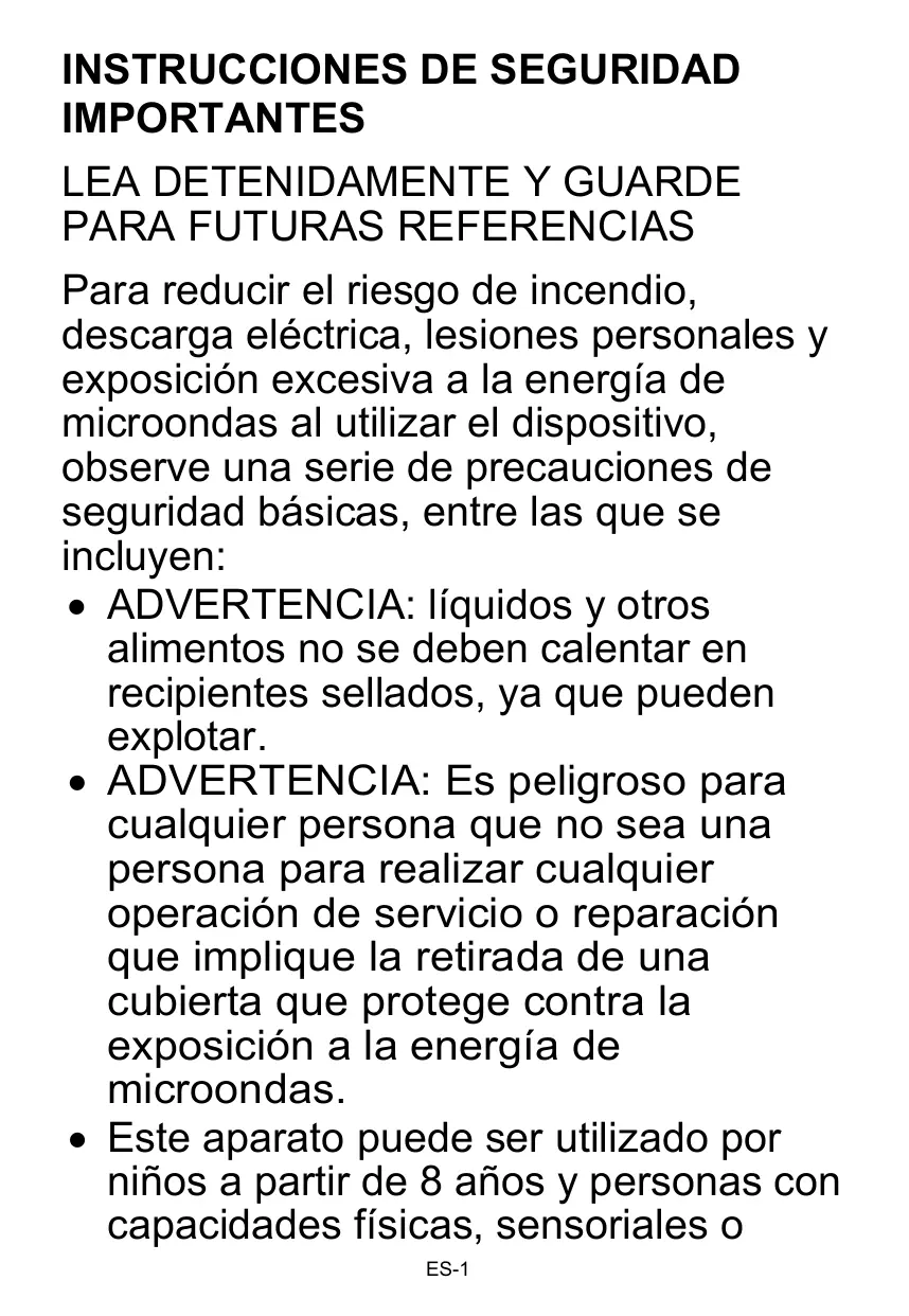 INSTRUCCIONES DE SEGURIDAD IMPORTANTES LEA DETENIDAMENTE Y GUARDE PARA FUTURAS REFERENCIAS Para reducir el riesgo de incendio, descarga eléctrica, lesiones personales y exposición excesiva a la energía de microondas al utilizar el dispositivo, observe una serie de precauciones de seguridad básicas, entre las que se incluyen: • ADVERTENCIA: líquidos y otros alimentos no se deben calentar en recipientes sellados, ya que pueden explotar. • ADVERTENCIA: Es peligroso para cualquier persona que no sea una persona para realizar cualquier operación de servicio o reparación que implique la retirada de una cubierta que protege contra la exposición a la energía de microondas. • Este aparato puede ser utilizado por niños a partir de 8 años y personas con capacidades físicas, sensoriales o ES-1