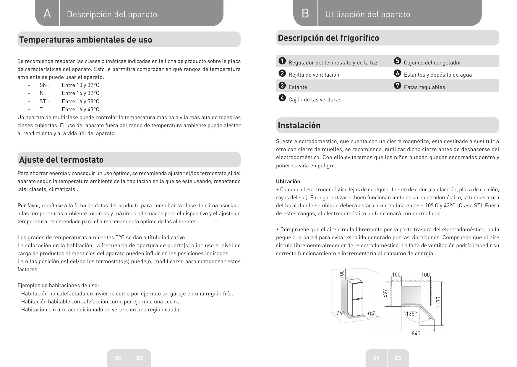 - Coloque el electrodomésico lejos de cualquier fuente de calor (calefacción, plac de coccción, rayos del sol). Para garantizar el buena funcionamento de su electrodomésico, la temperatura del localdonde se ubiquedeferaste comparidadentre +10^ C y 43^ (Clase ST).Fuera de这些rangos,el electrodomésico no funciona con normalidad.