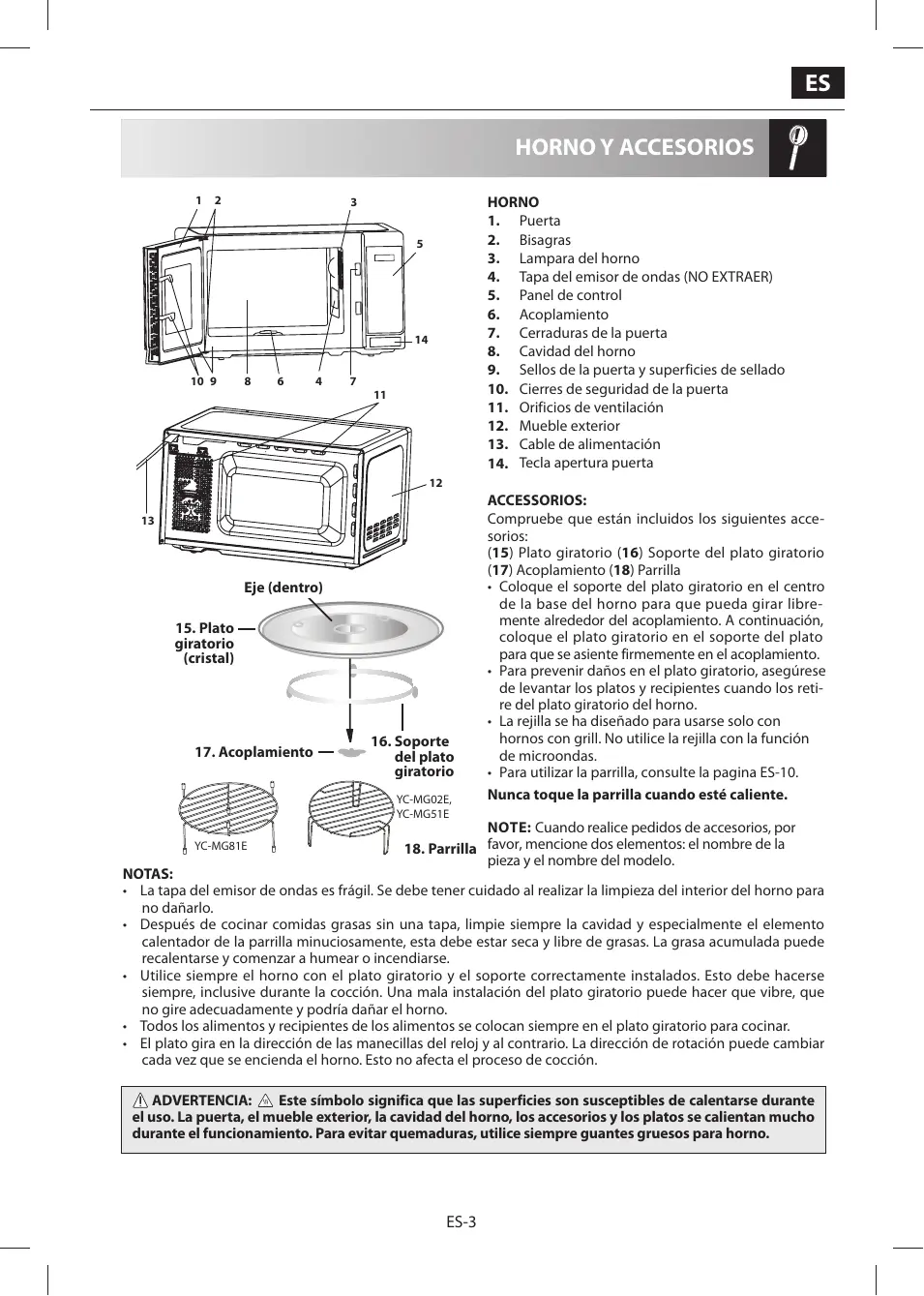 La tapa del emisor de onda es una pieza que se consume y sin una limpieza regular, tendrá que ser reemplazada. ACCESORIOS: Los accesorios como el plato giratorio, el soporte del plato giratorio y la parrilla se deben lavar con solución líquida suave y secar. Son aptos para el lavavajillas. Puerta Para eliminar todo rastro de suciedad, limpiar regularmente ambos lados de la puerta, los sellos de las puertas y las partes adyacentes con un paño suave y húmedo. No utilizar un limpiador abrasivo. NOTA: No se debe utilizar un limpiador a vapor.