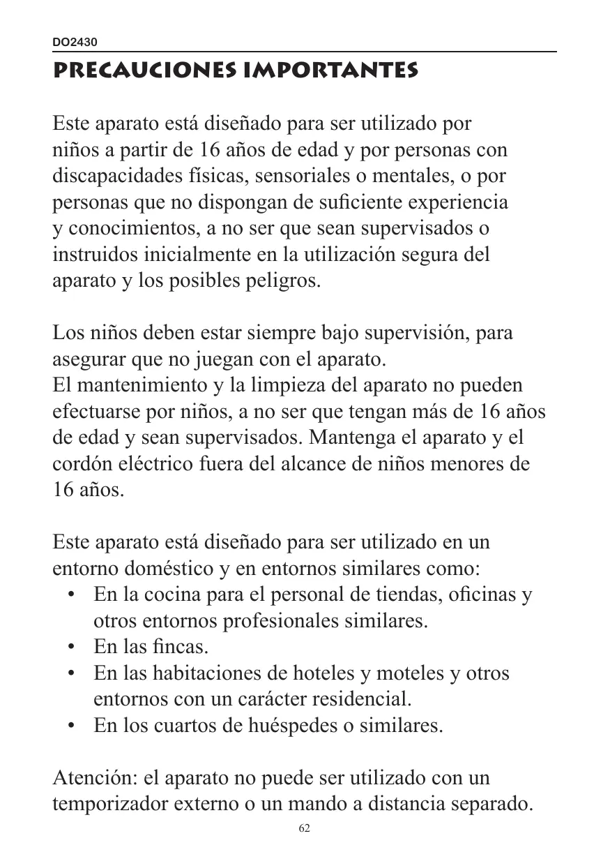 PRECAUCIONES IMPORTANTES Este aparato está diseñado para ser utilizado por niños a partir de 16 años de edad y por personas con discapacidades físicas, sensoriales o mentales, o por personas que no dispongan de suficiente experiencia y conocimientos, a no ser que sean supervisados o instruidos inicialmente en la utilización segura del aparato y los posibles peligros. Los niños deben estar siempre bajo supervisión, para asegurar que no juegan con el aparato. El mantenimiento y la limpieza del aparato no pueden efectuarse por niños, a no ser que tengan más de 16 años de edad y sean supervisados. Mantenga el aparato y el cordón eléctrico fuera del alcance de niños menores de 16 años. Este aparato está diseñado para ser utilizado en un entorno doméstico y en entornos similares como: