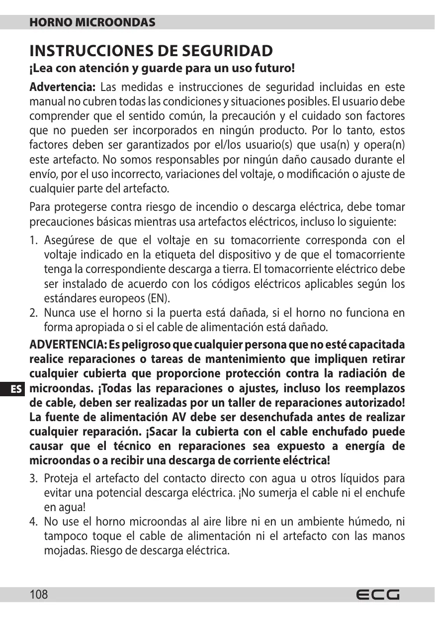 ADVERTENCIA: Es peligroso querialquier persona que no estecapacitatada realice reparaciones o tareas deostenimiento que impliquen retiringcualquier cubierta que proportione proteccion contra la radiacion de microondas. ;Todas las reparaciones o ajustes, incluso los reemplazosde cable, deben ser realizadas por un taller de reparaciones autorizzato! La fuente de alimentacion AVDebe ser desenchufada antes de realizarcualquier reparacion. ;Sacar la cubierta con el cable enchufado pueedcaesar que el techniciano en reparaciones sea expuesto a energia delmicroondas o a recibir una descarga de corrienteelectrica!