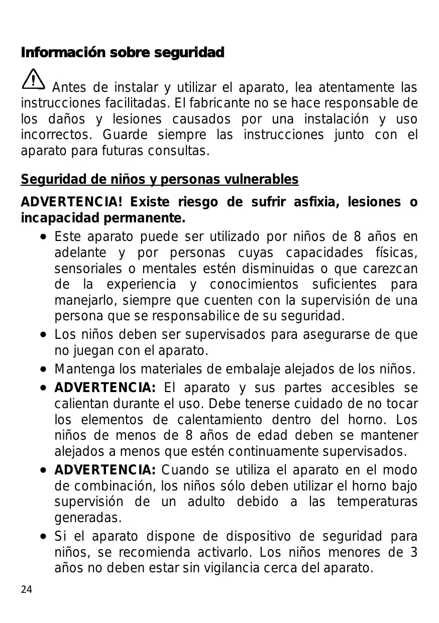 Antes de instalar y utilizar el aparato, lea atentamente las instrucciones facilitadas. El fabricante no se hace responsable de los daños y lesiones causados por una instalación y uso incorrectos. Guarde siempre las instrucciones junto con el aparato para futuras consultas. Seguridad de niños y personas vulnerables ADVERTENCIA! Existe riesgo de sufrir asfixia, lesiones o incapacidad permanente. Este aparato puede ser utilizado por niños de 8 años en adelante y por personas cuyas capacidades físicas, sensoriales o mentales estén disminuidas o que carezcan de la experiencia y conocimientos suficientes para manejarlo, siempre que cuenten con la supervisión de una persona que se responsabilice de su seguridad. Los niños deben ser supervisados para asegurarse de que no juegan con el aparato. Mantenga los materiales de embalaje alejados de los niños. ADVERTENCIA: El aparato y sus partes accesibles se calientan durante el uso. Debe tenerse cuidado de no tocar los elementos de calentamiento dentro del horno. Los niños de menos de 8 años de edad deben se mantener alejados a menos que estén continuamente supervisados. ADVERTENCIA: Cuando se utiliza el aparato en el modo de combinación, los niños sólo deben utilizar el horno bajo supervisión de un adulto debido a las temperaturas generadas. Si el aparato dispone de dispositivo de seguridad para niños, se recomienda activarlo. Los niños menores de 3 años no deben estar sin vigilancia cerca del aparato. 24